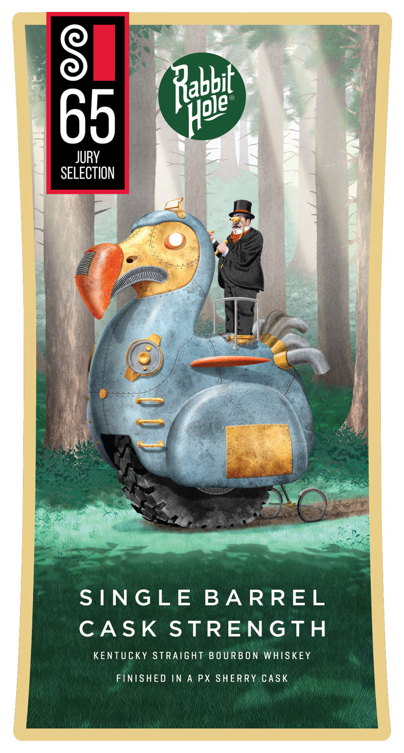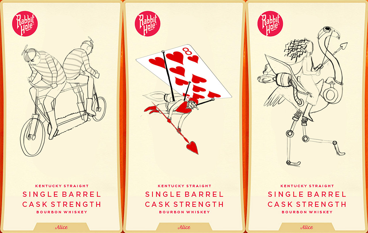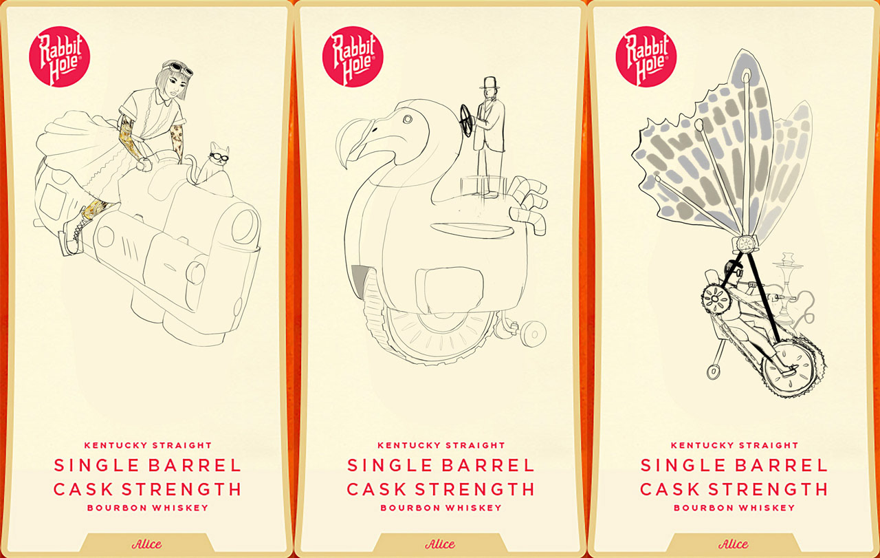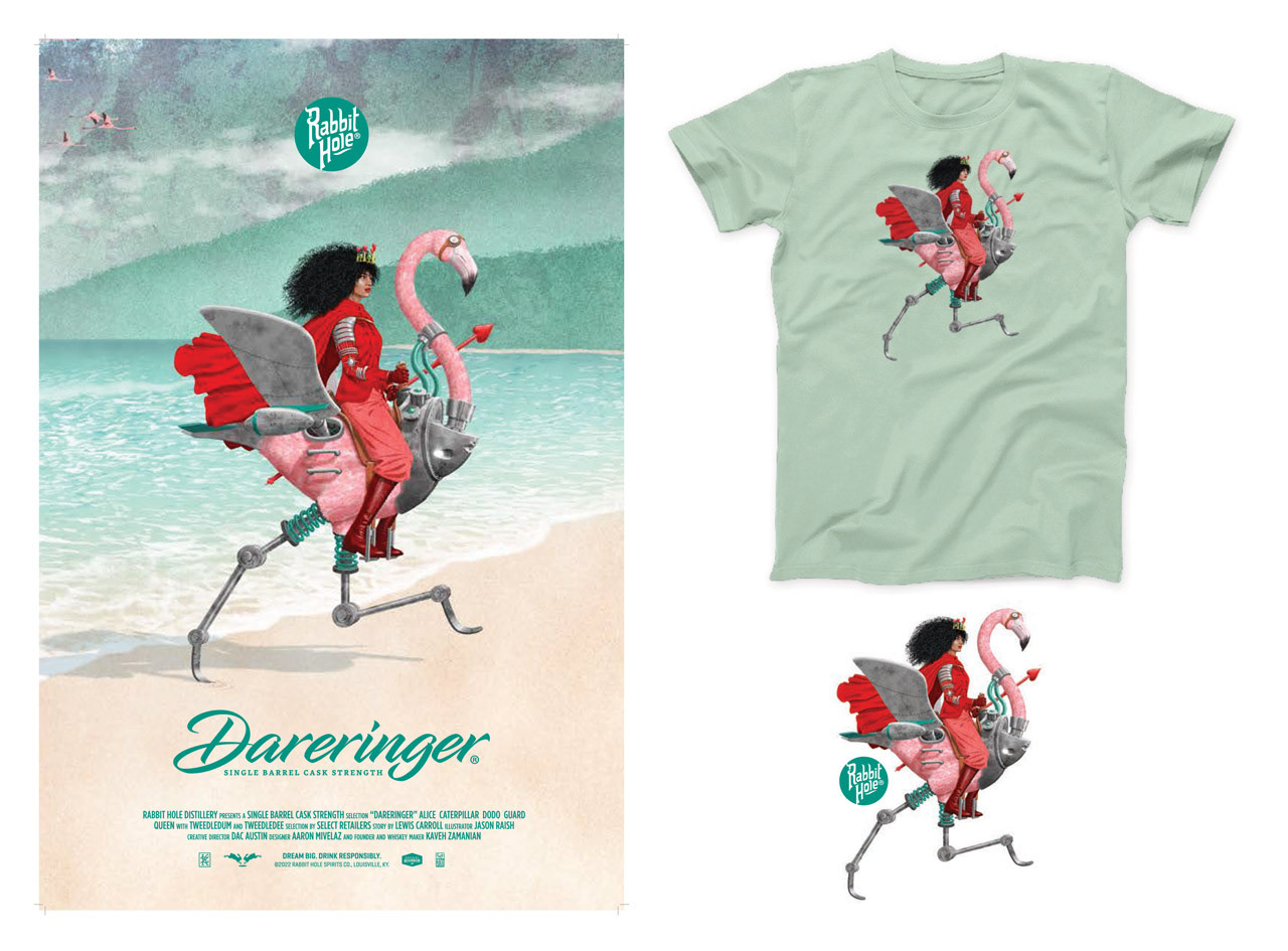 Limited edition artist series bottles for Rabbit Hole Distillery. I reimagined Lewis Carroll’s Alice in Wonderland characters in a sort of Steam Punk vehicle riding world. Alice is all grown up and tatted with Dinah as co-pilot in the front. The Dodo, (who was a metaphor for politicians) has a Boss Tweed type driver atop his destructive steel behemoth. The Caterpillar has emerged from his cocoon even more twee and affectatious than before and flies away in a puff of hookah smoke. Will Tweedle Dee and Tweedle Dum ever make it out of the forest while working against their own interests? The Queen’s Card Guardsman patrols the night skies. The Queen of Hearts is imposing on her half flamingo-half machine. “Dareringer” is single barrel cask strength Kentucky straight bourbon whiskey finished in Pedro Ximénez sherry casks at 118 proof and luckily is my favorite of all their offerings. Available at select retailers in South Carolina and Texas. Posters, T-shirts, and stickers are also available. This was an incredible amount of work conceptualizing and designing and redesigning these characters and backgrounds. Alice in wonderland is beloved and has been reimagined so many times it took so long to develop something new. We had several half starts and reworks but in the end it was worth it, the bottles are beautifully printed and even have spot gloss embossing on the art. Time for me to go have 2 or 3 (or 4) fingers, Cheers!