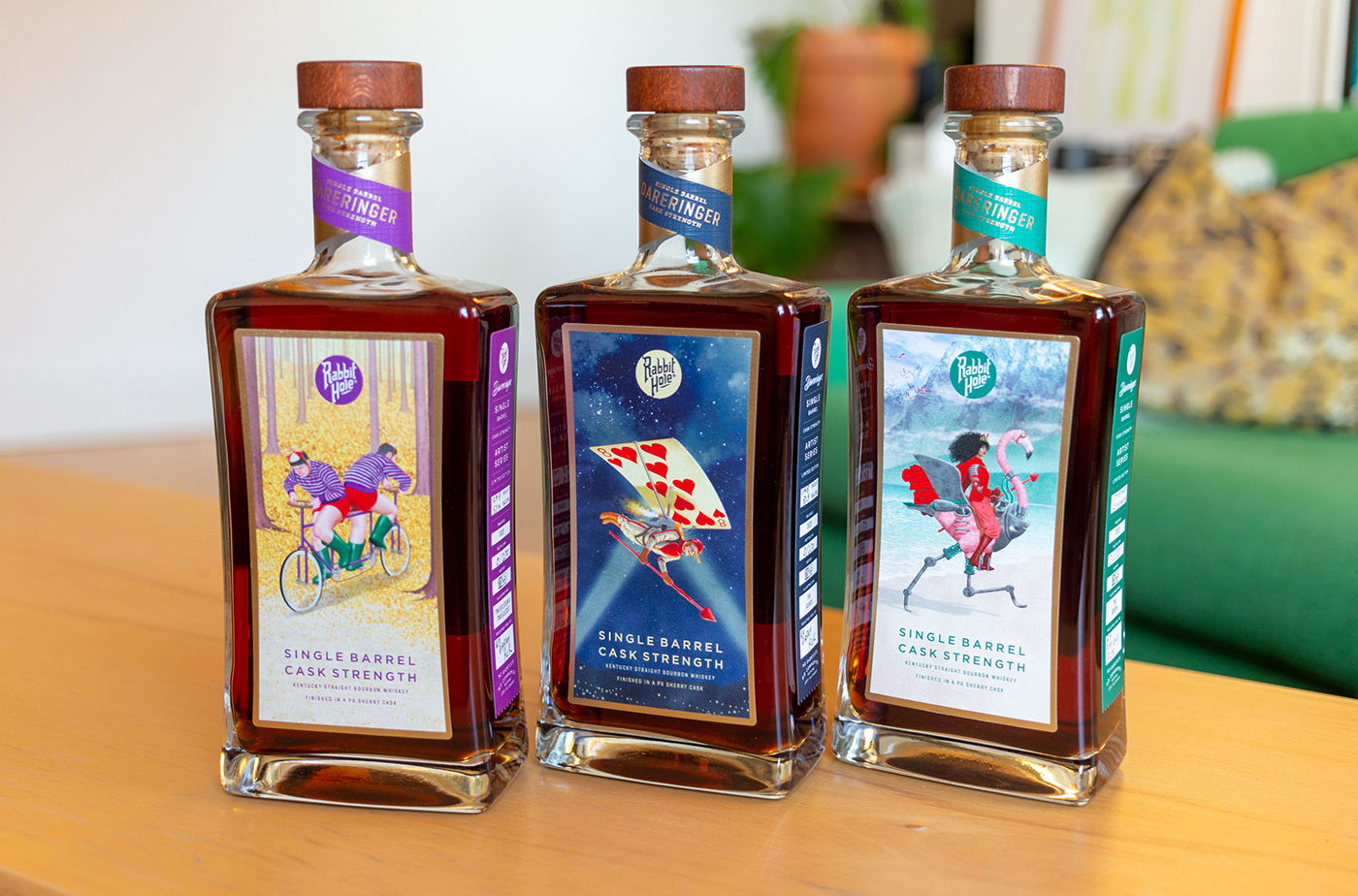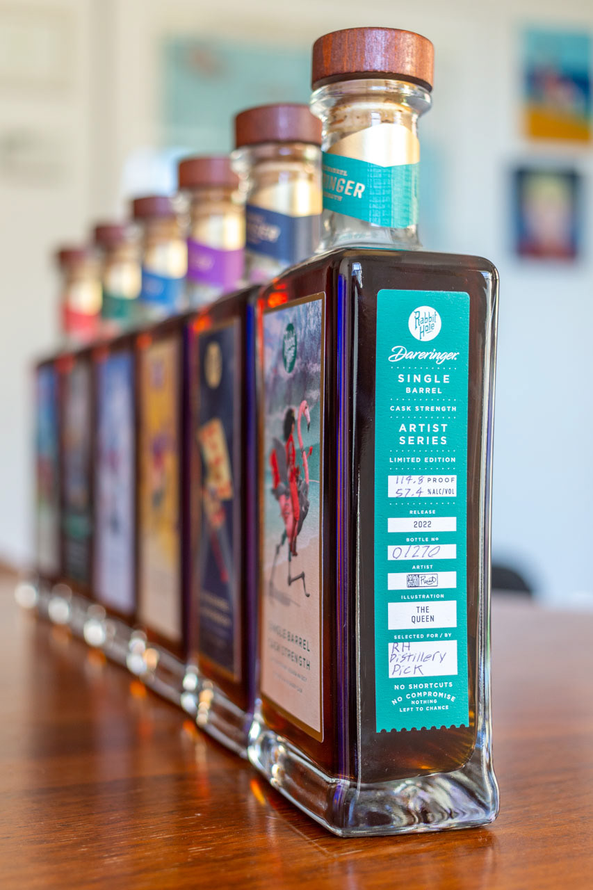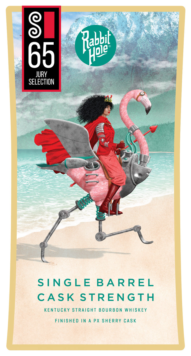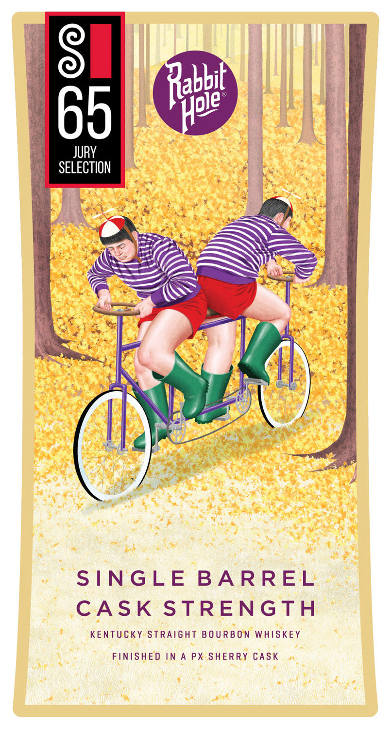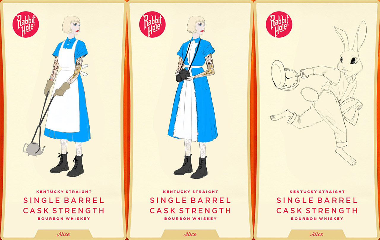 Limited edition artist series bottles for Rabbit Hole Distillery. I reimagined Lewis Carroll’s Alice in Wonderland characters in a sort of Steam Punk vehicle riding world. Alice is all grown up and tatted with Dinah as co-pilot in the front. The Dodo, (who was a metaphor for politicians) has a Boss Tweed type driver atop his destructive steel behemoth. The Caterpillar has emerged from his cocoon even more twee and affectatious than before and flies away in a puff of hookah smoke. Will Tweedle Dee and Tweedle Dum ever make it out of the forest while working against their own interests? The Queen’s Card Guardsman patrols the night skies. The Queen of Hearts is imposing on her half flamingo-half machine. “Dareringer” is single barrel cask strength Kentucky straight bourbon whiskey finished in Pedro Ximénez sherry casks at 118 proof and luckily is my favorite of all their offerings. Available at select retailers in South Carolina and Texas. Posters, T-shirts, and stickers are also available. This was an incredible amount of work conceptualizing and designing and redesigning these characters and backgrounds. Alice in wonderland is beloved and has been reimagined so many times it took so long to develop something new. We had several half starts and reworks but in the end it was worth it, the bottles are beautifully printed and even have spot gloss embossing on the art. Time for me to go have 2 or 3 (or 4) fingers, Cheers!