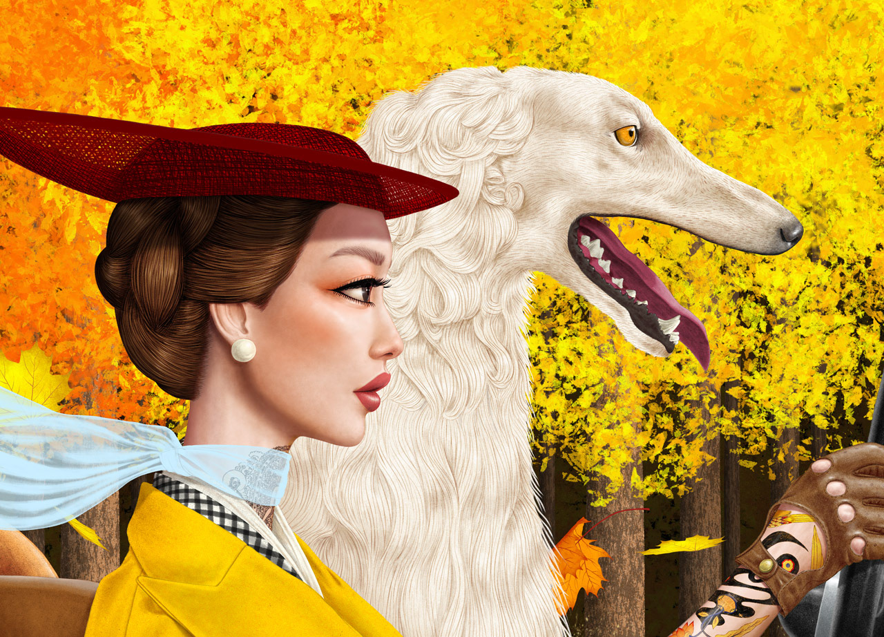 The autumn entry into my 4 seasons of high fashion women with giant breed dogs series. A Borzoi sittin’ shotgun in a 1950 Jaguar XK120 OTS. Centuries old Korean art tattoos, a Bicorne Skimmer hat by Lilly Daché, and the suit is by Frost Brothers. This piece was chosen for the Society of Illustrators annual show. Prints available here https://society6.com/product/autumn-drive-with-borzoi_print?sku=s6-8539058p4a1v2