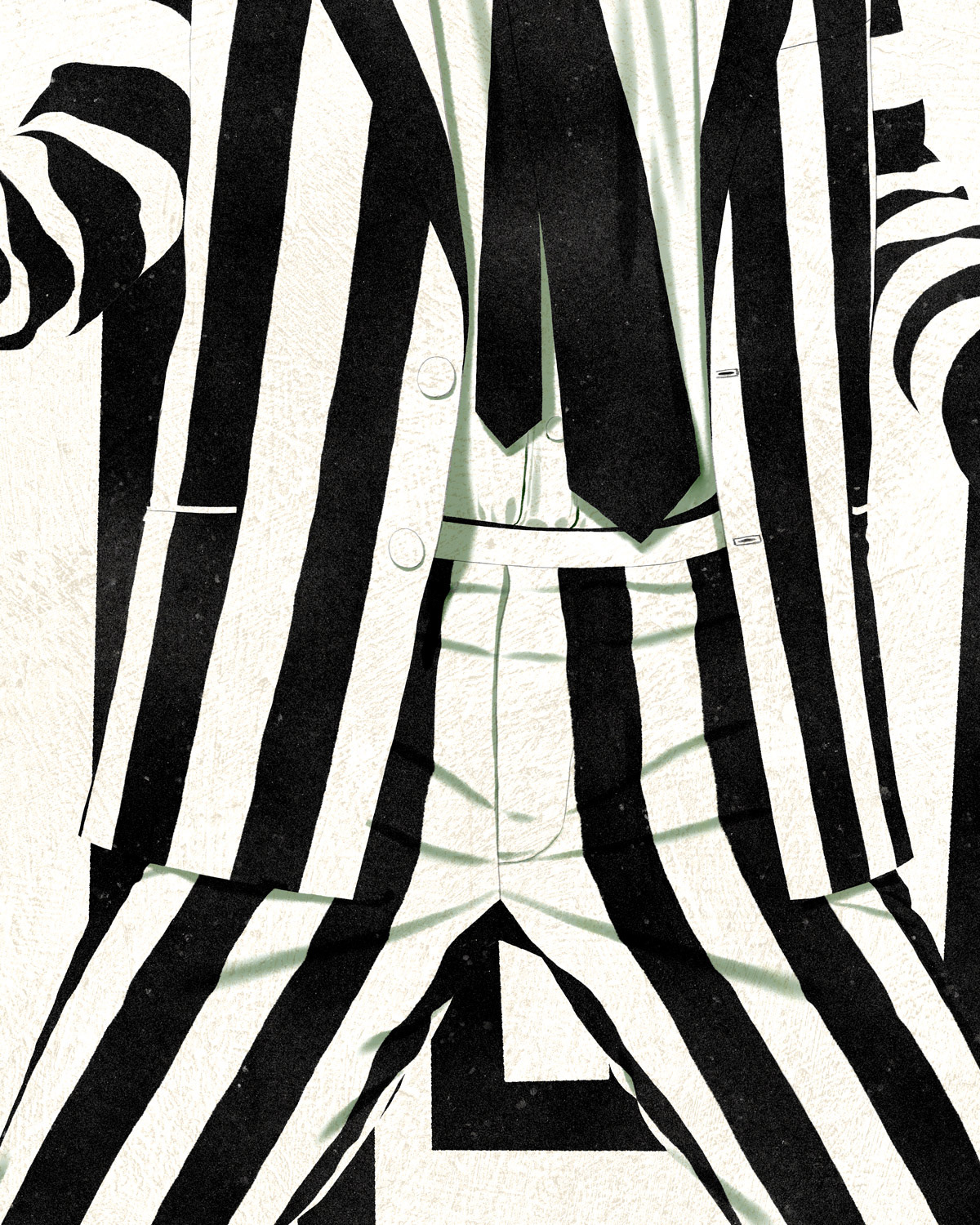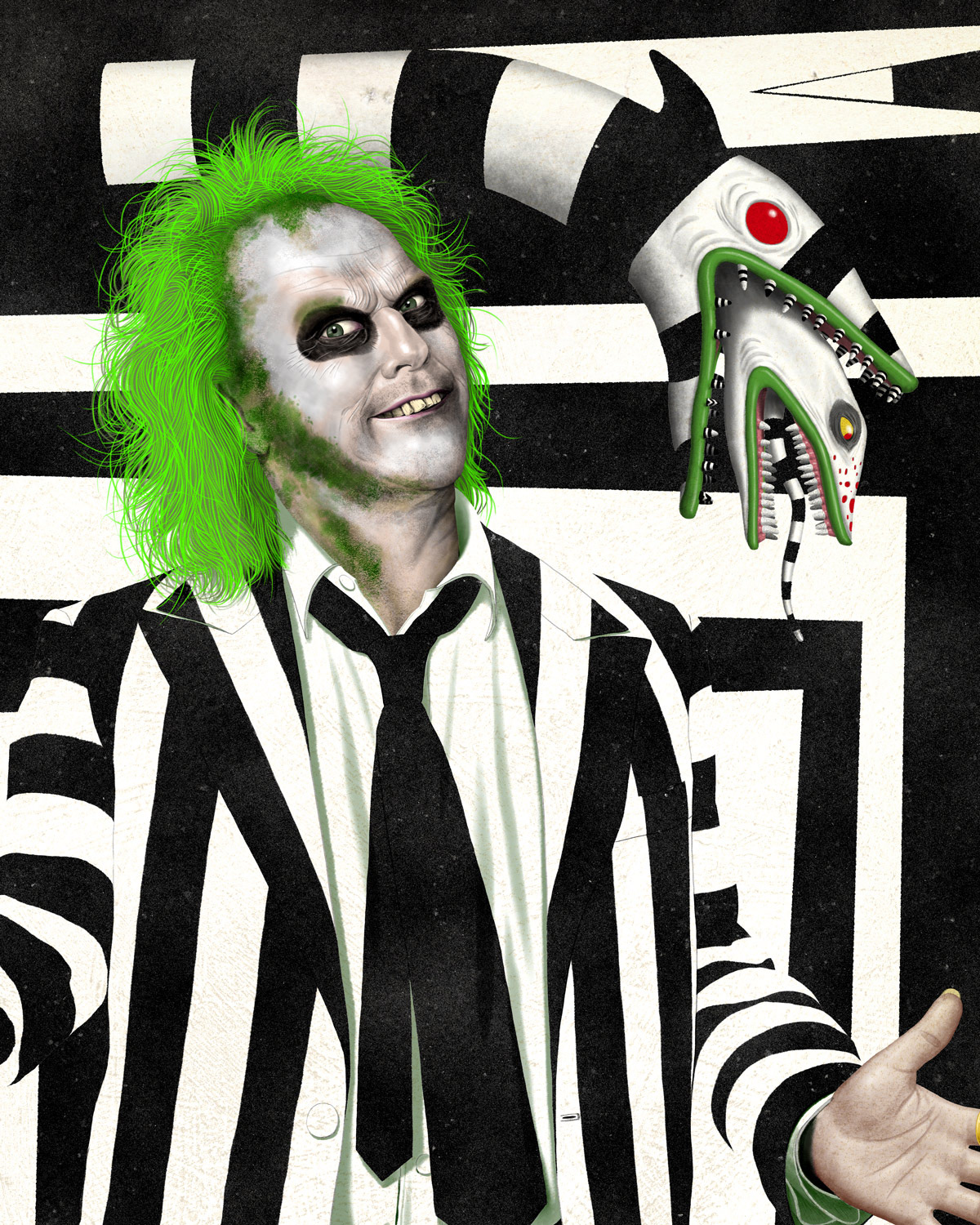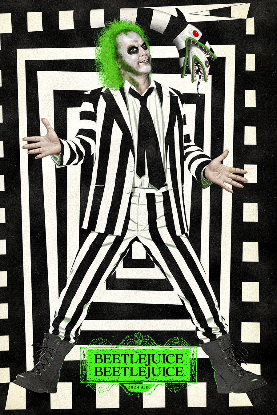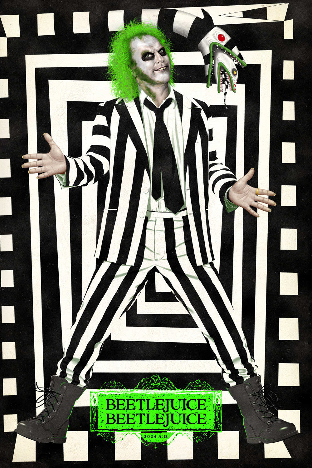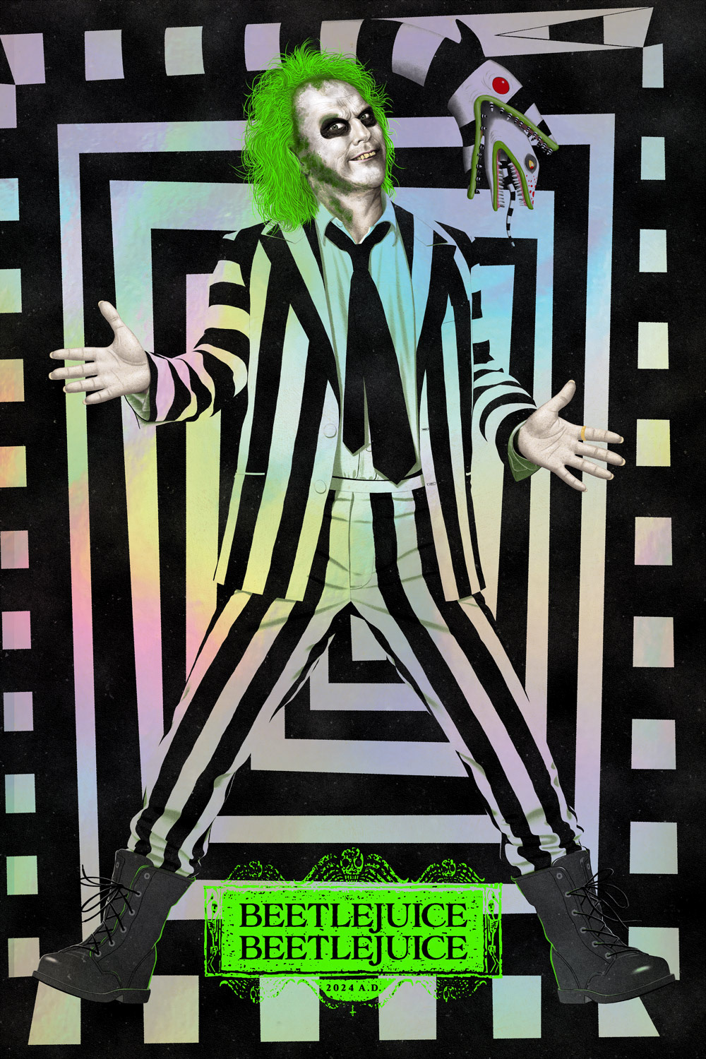 Officially licensed poster for Tim Burton's Beetlejuice Beetlejuice sequel. Micheal Keaton is back as the ghost with the most as are those darned sandworms. I always loved the bold graphic nature of the suit and when I saw the first promo images coming out months before the movie premiere I knew I wanted to pursue something with the stripes. 24x36" screenprint. Regular edition of 150, Foil variant edition of 75, Lenticular plex edition of 50, Acrylic panel print edition of 50.