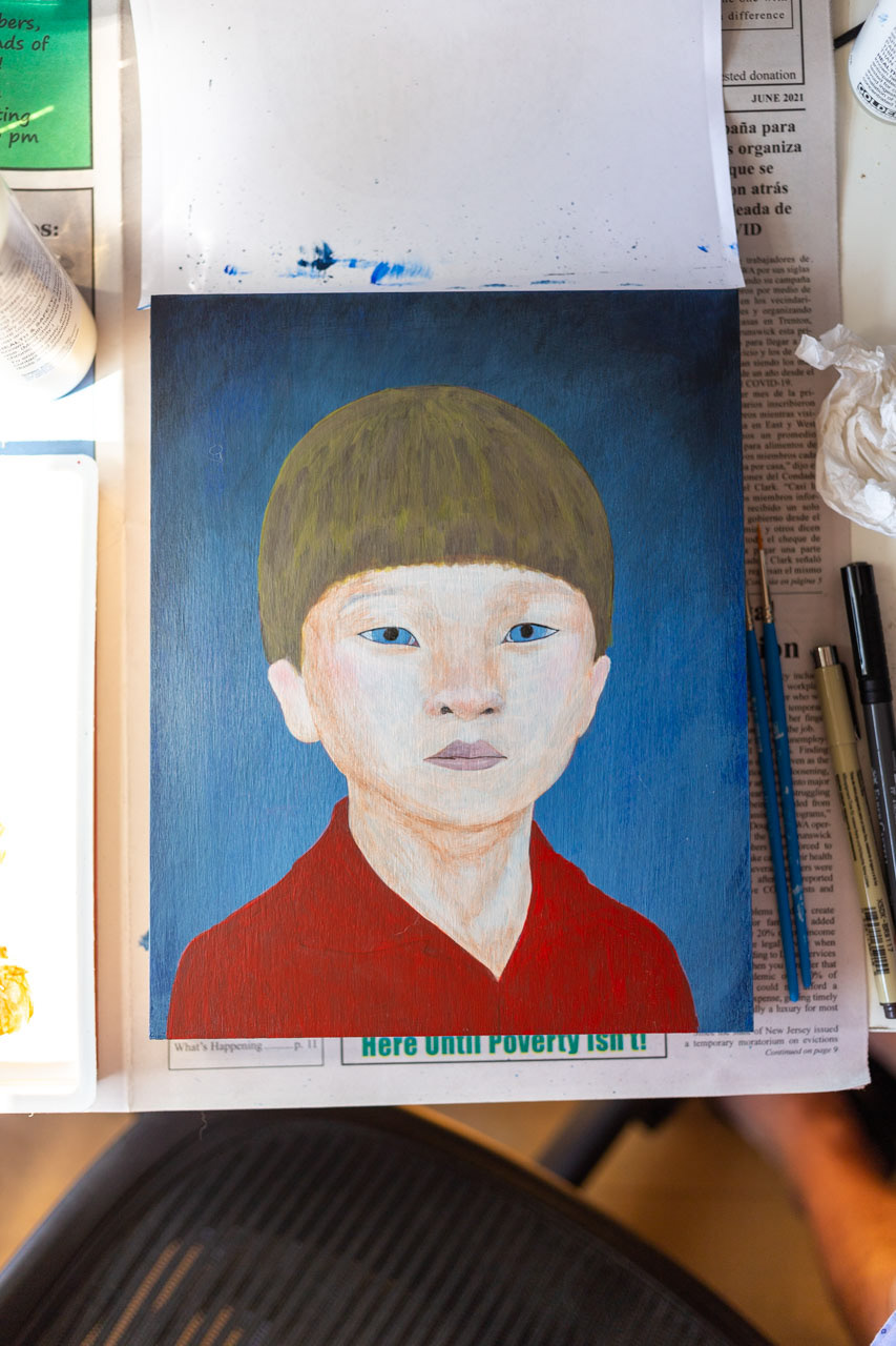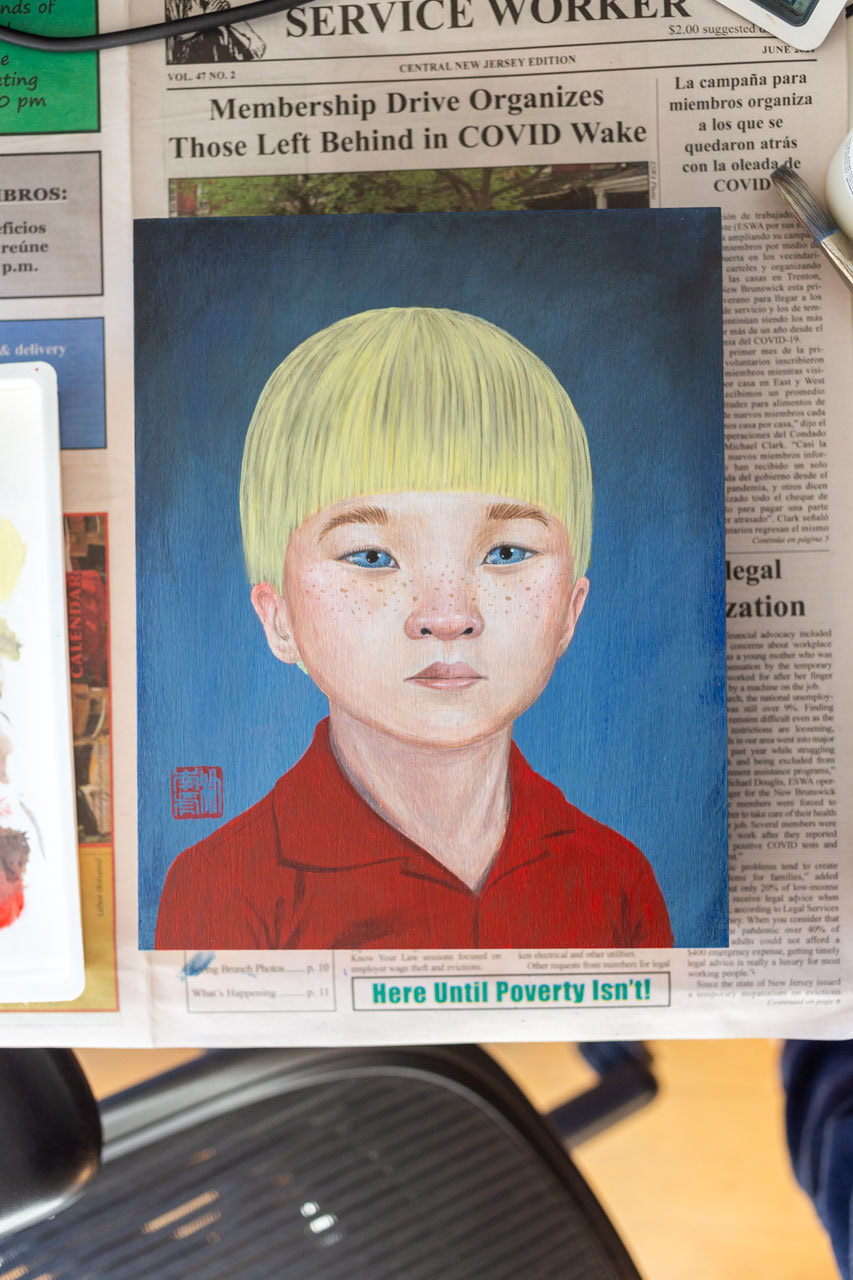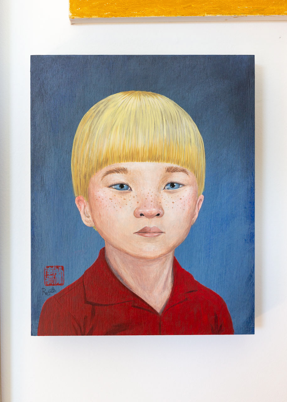 Hey non-white person that grew up in a predominantly white area. As a kid did you ever wish a magic genie could grant your wish and you'd wake up with blonde hair and blue eyes? Careful what you wish for, boy. As a kid in my all white 3 stoplight town in western New York state i wished I could be white, viewed as normal, that my appearance wouldn't be the reason for my ridicule, that i could be viewed as a suitable/acceptable to date. Now I would not trade being Korean and Asian, for all the gold coins in the world. "Careful What You Wish For, Boy" 8x10" acrylic on wood panel 2021 This cautionary painting is based on one of my school photos and is part of the exhibit "Luminous Odyssey" with WOWxWOW November 5th – 26th. Original painting available on their website. https://wowxwow.com/