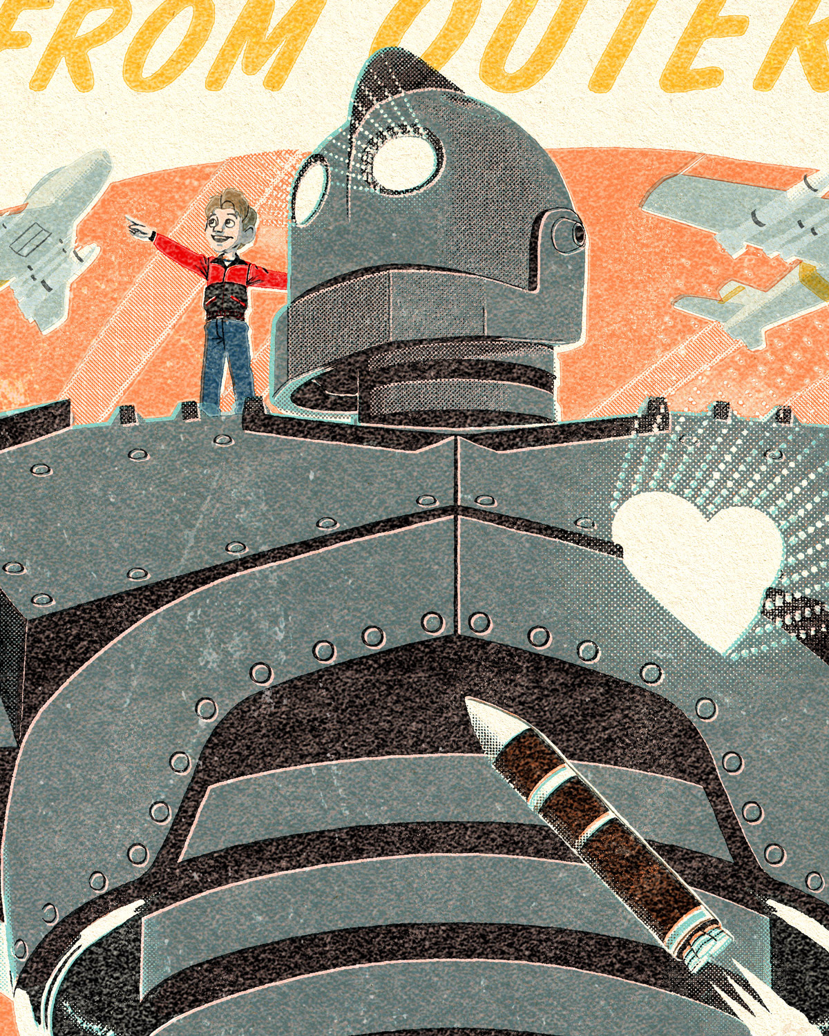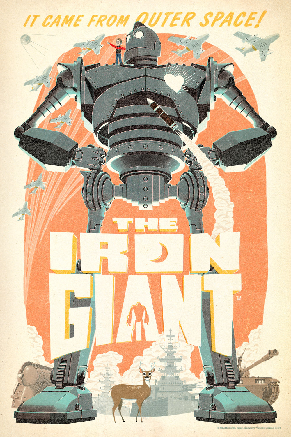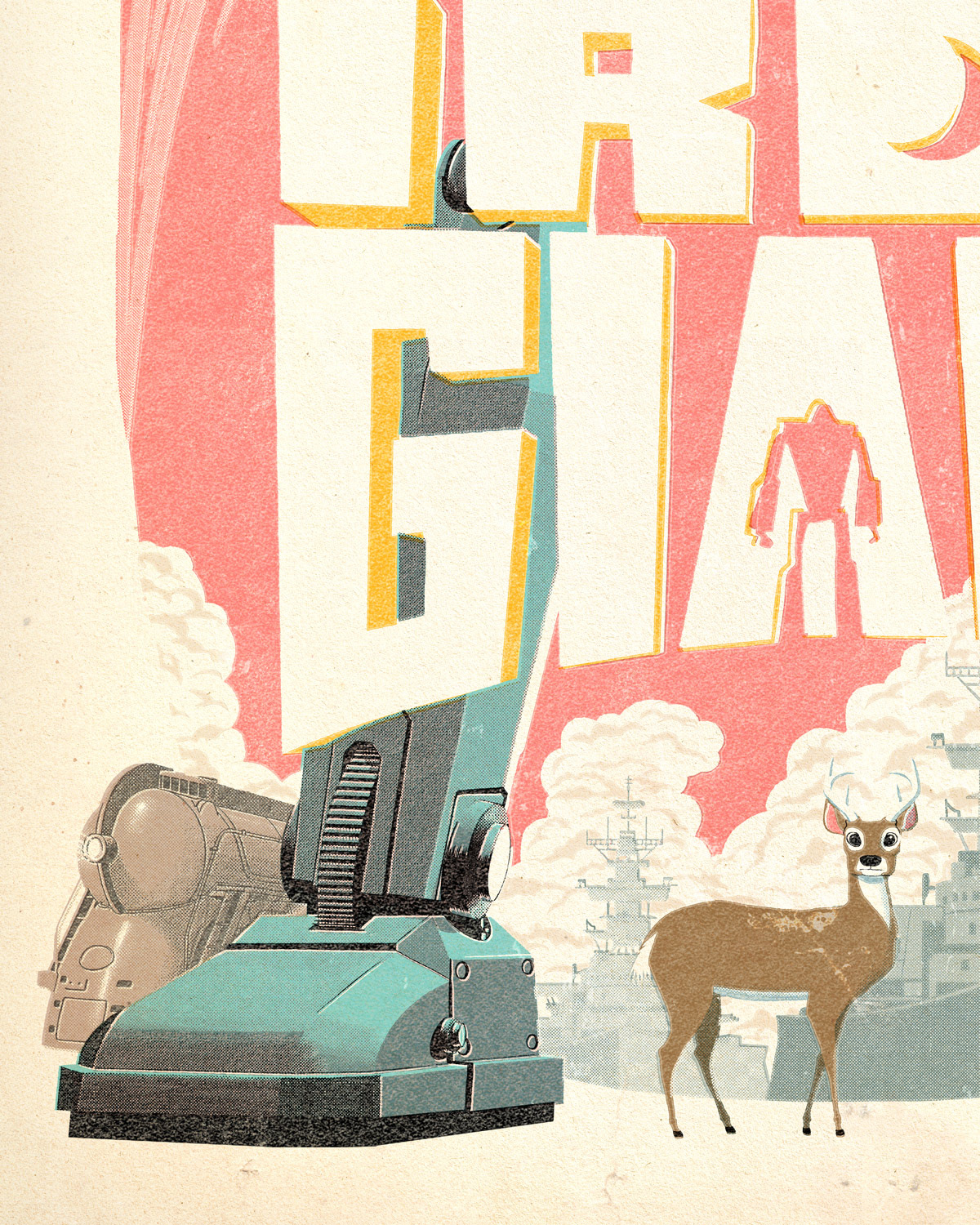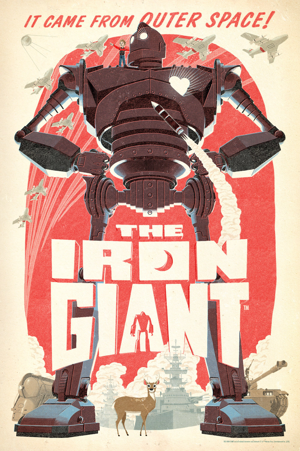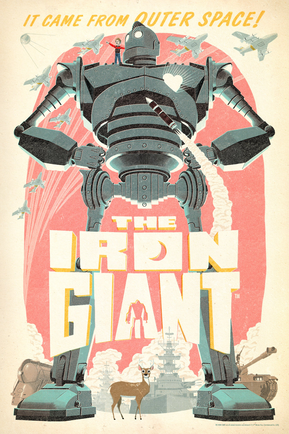 24x36" screen printed officially licensed posters for The Iron Giant, directed by Brad Bird, released with Bottleneck Gallery. The film is set in 1957 so I wanted to give it a mid century offset printing treatment appropriate to the era.