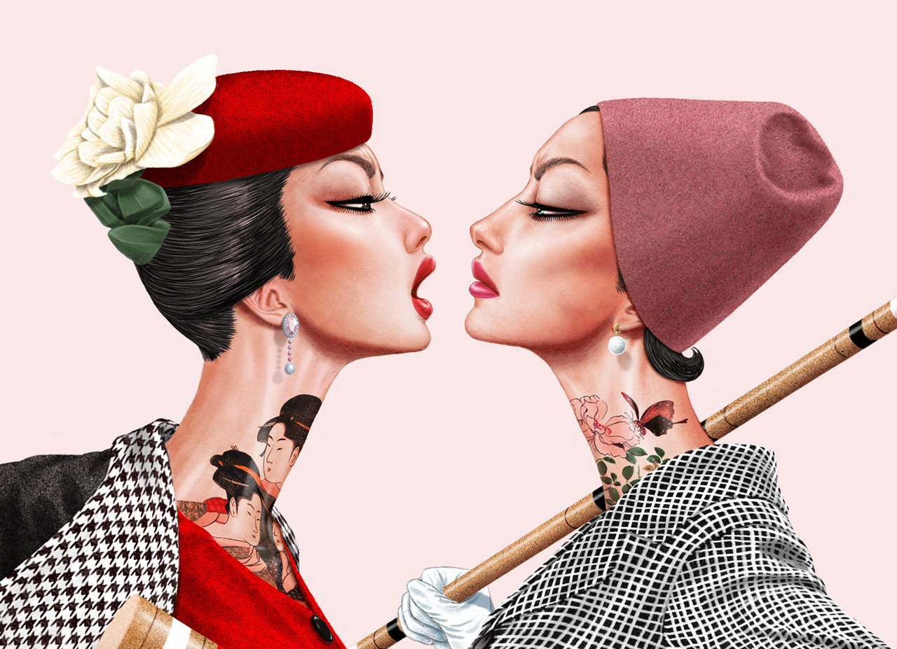 Insert your best classy yet trashy insult here. 1950s stylings, Japanese Ukiyo-e tattoos. Prim and proper meets rebellion and self expression. This series was chosen for the Society of Illustrator's annual show. Prints available here: https://society6.com/product/croquet-and-ink-nine_print?sku=s6-8831966p4a1v1