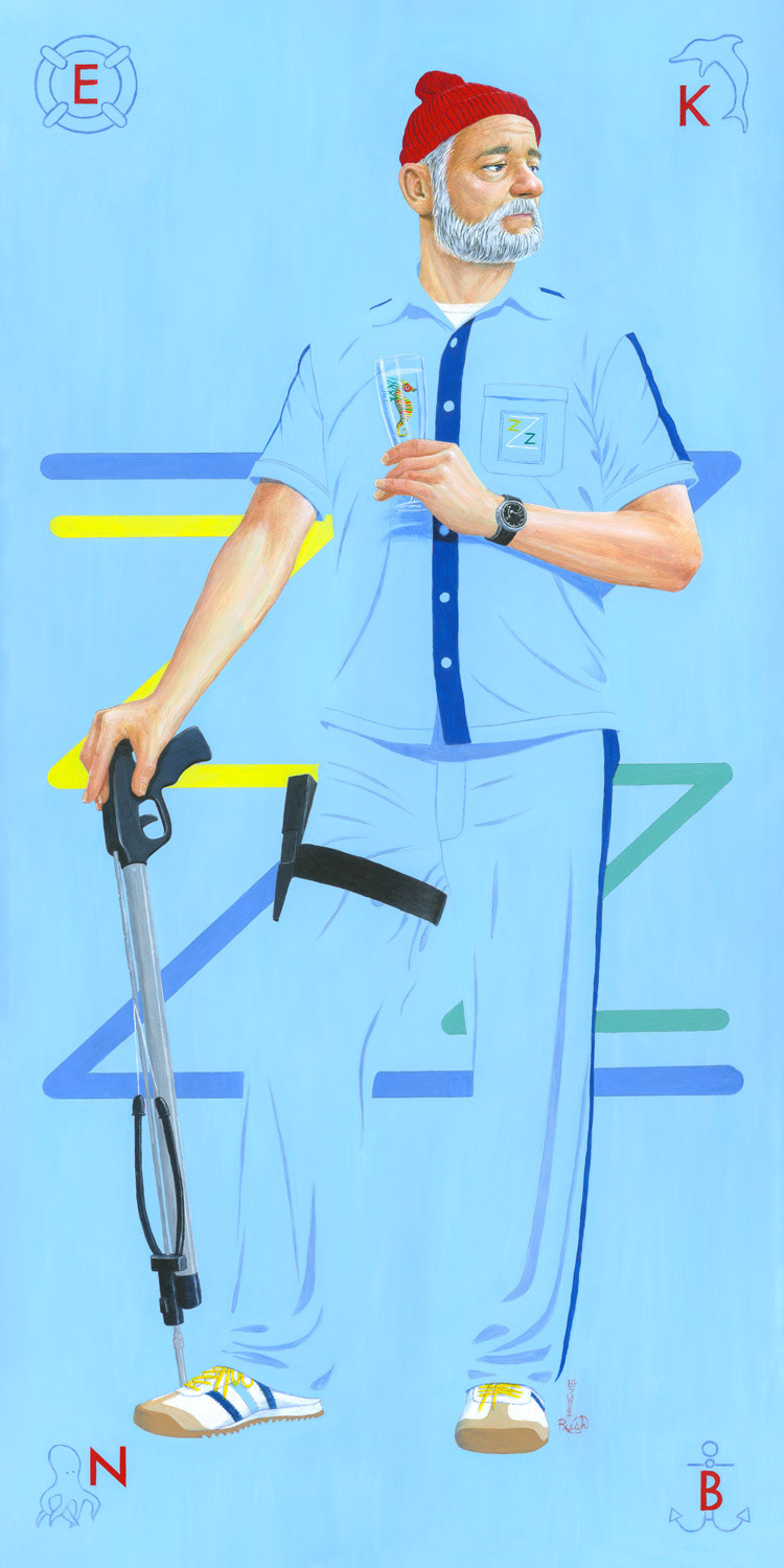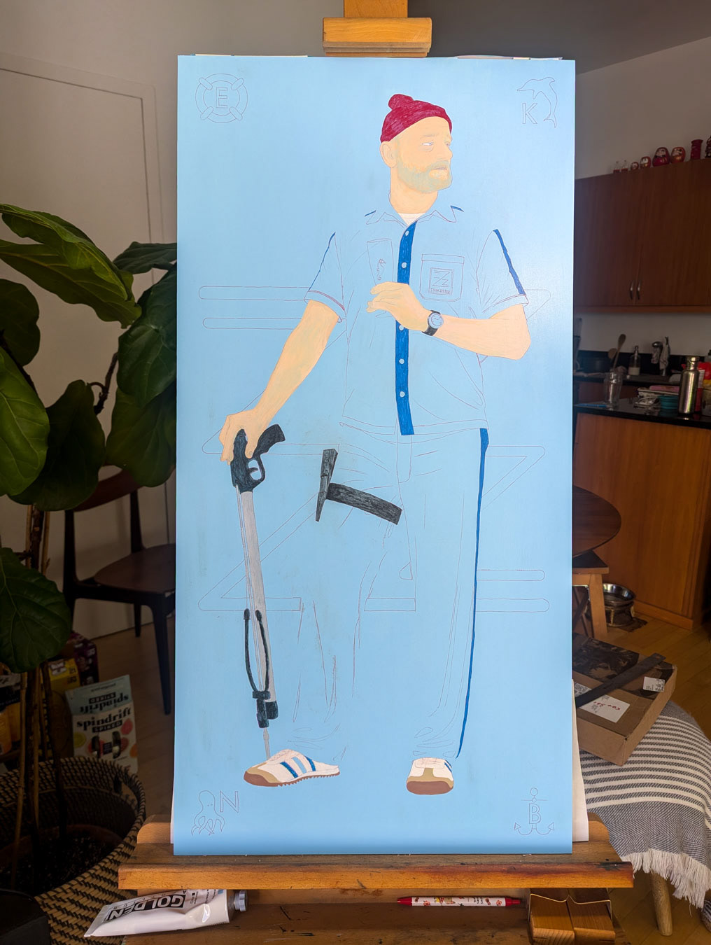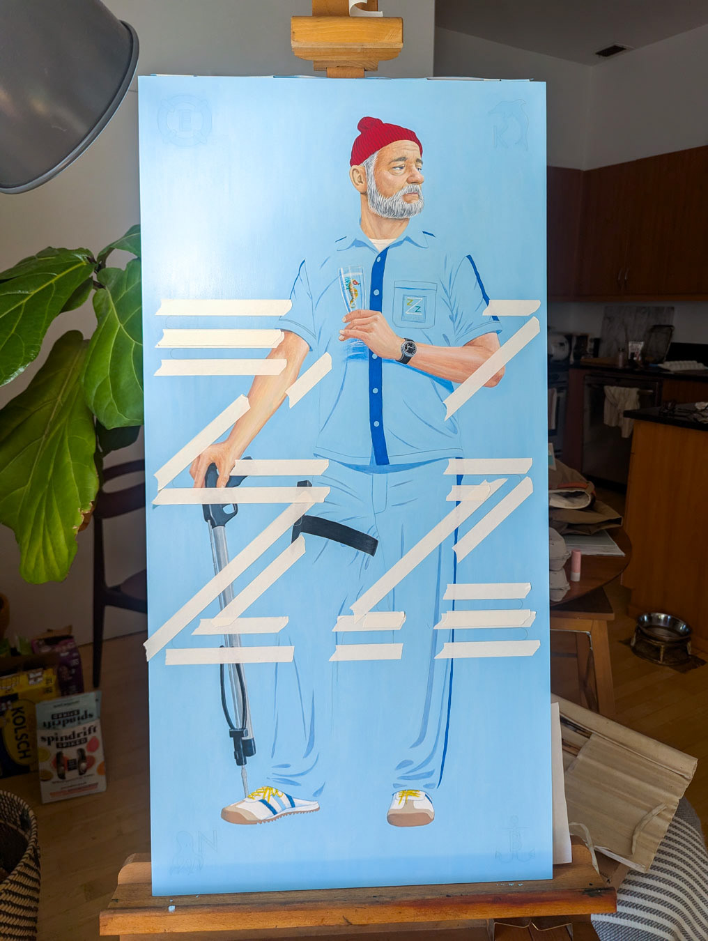 The films of Wes Anderson inspire the work in Spoke Art's show, Bad Dads 2024, which is a semi-annual group exhibition. This time it's officially licensed by Wes himself. Here's my 18x36" acrylic on wood panel painting. It's hard to chose a favorite but The Life Aquatic is up there for me. The "fade-away" style I used is more than aesthetic. Bill Murray's character Steve Zissou was all encompassing and the world he built engulfed everyone. Where does Steve Zissou the personality end and the man begin? I also made a vintage style poster for The Life Aquatic for this show.