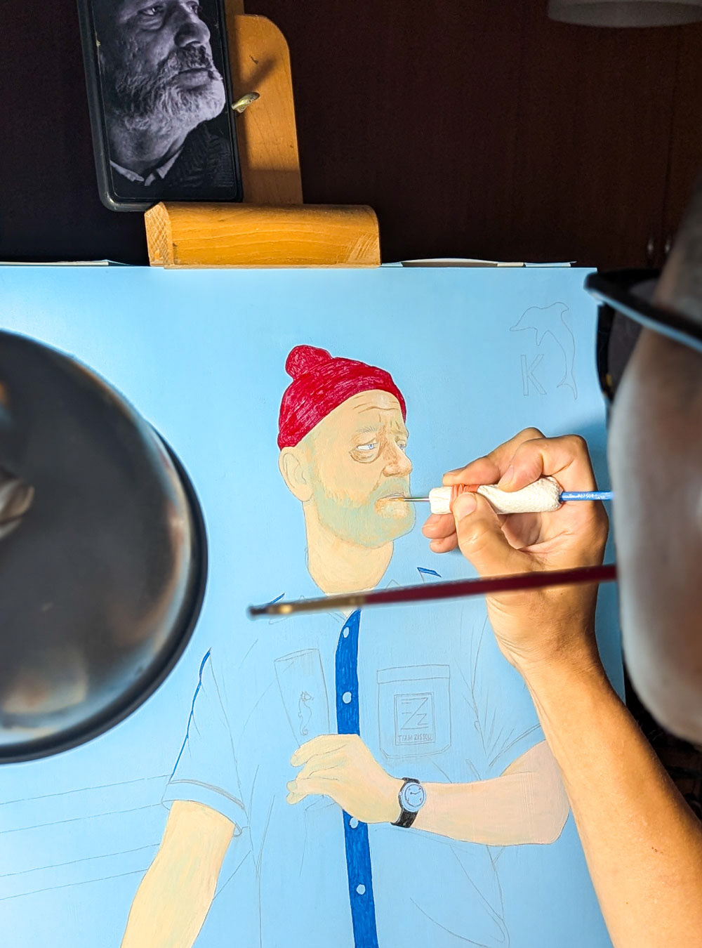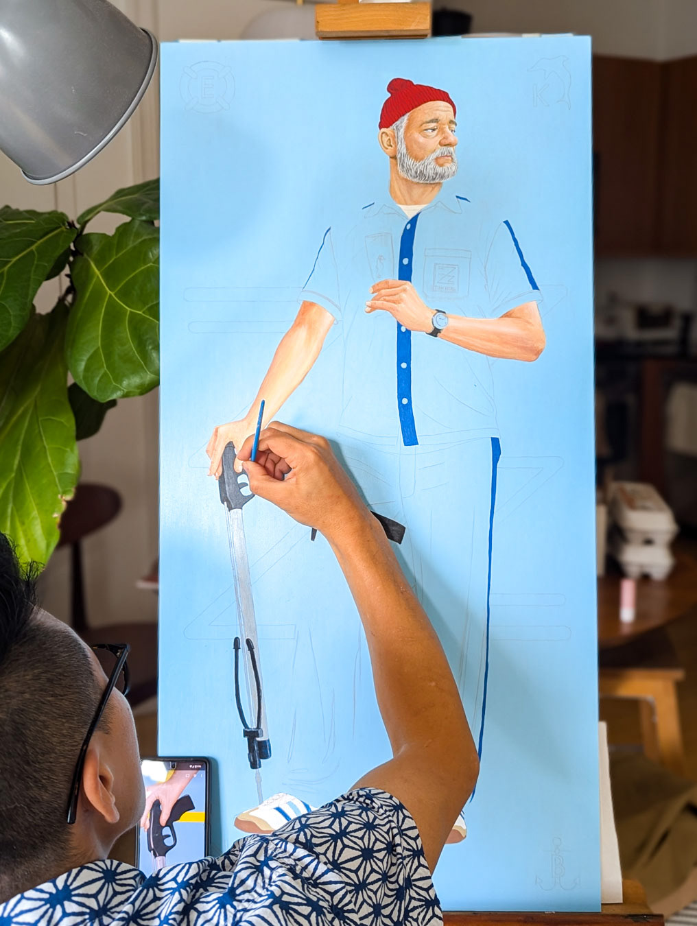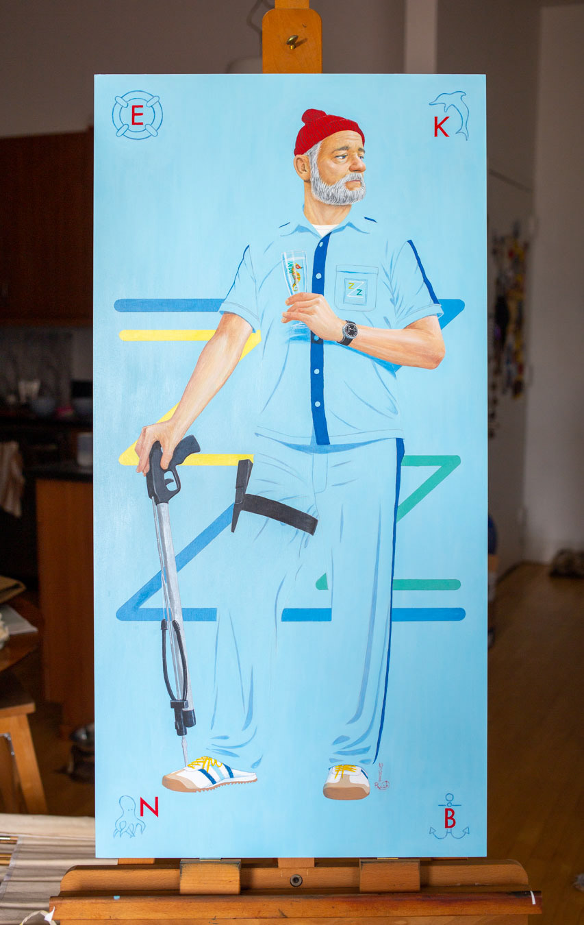 The films of Wes Anderson inspire the work in Spoke Art's show, Bad Dads 2024, which is a semi-annual group exhibition. This time it's officially licensed by Wes himself. Here's my 18x36" acrylic on wood panel painting. It's hard to chose a favorite but The Life Aquatic is up there for me. The "fade-away" style I used is more than aesthetic. Bill Murray's character Steve Zissou was all encompassing and the world he built engulfed everyone. Where does Steve Zissou the personality end and the man begin? I also made a vintage style poster for The Life Aquatic for this show.