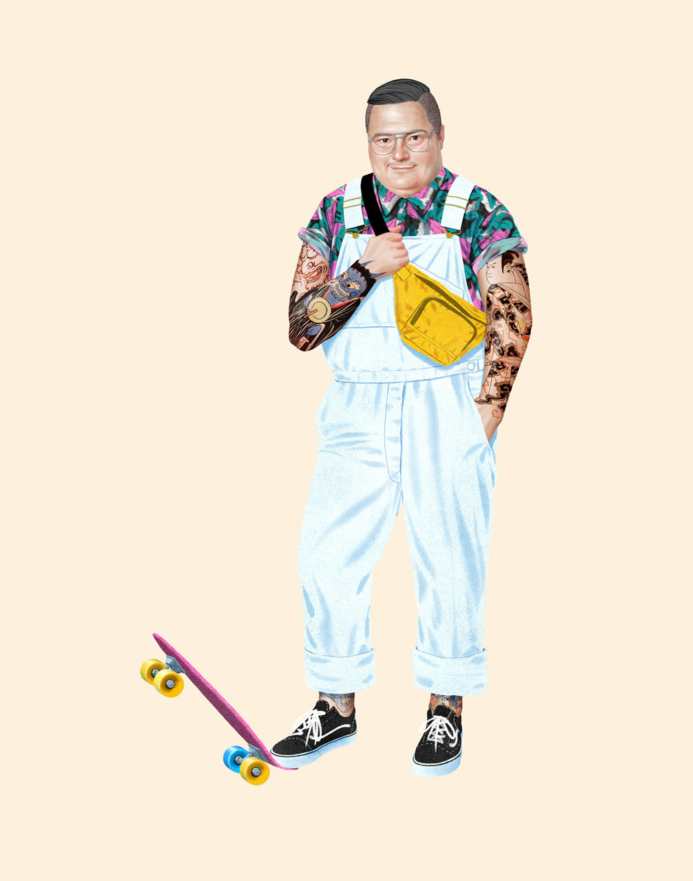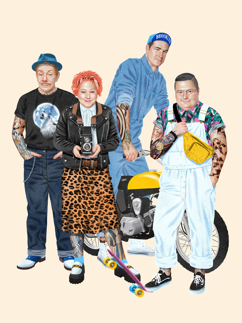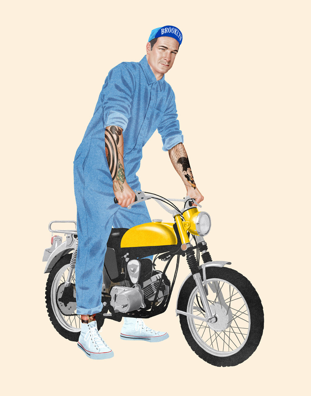 Hipster Seinfeld - 2nd String. What if the secondary characters of Seinfeld also lived in Brooklyn? What if Frank and Estelle Costanza lived in Bushwick instead of Queens? Would Frank frequent the dive bars in his slevedge denim and wolf howl t-shirt drinking ironic Miller Highlifes while Estelle snaps photos on her medium format film camera (RIP Estelle Harris)? Puddy was a mechanic on the show and his boilder suit has come back into fashion and after his food delivery gigs he works on his little 1980s Japanese 80cc motorcycles that he got working once at his uncle’s house in rural Connecticut one weekend. Newman skates home on his mini cruiser board, listening to Fleetwood Mac’s “Dreams” whilst sipping a Mellow Yellow after a hard day’s work at the post office (Yes that’s his Jurassic Park shirt). Group and singles prints available on Spokeart’s site April 8th at 10am PST www.spoke-art.com here’s a parting shot of the Apt 5A crew i did a few years ago.