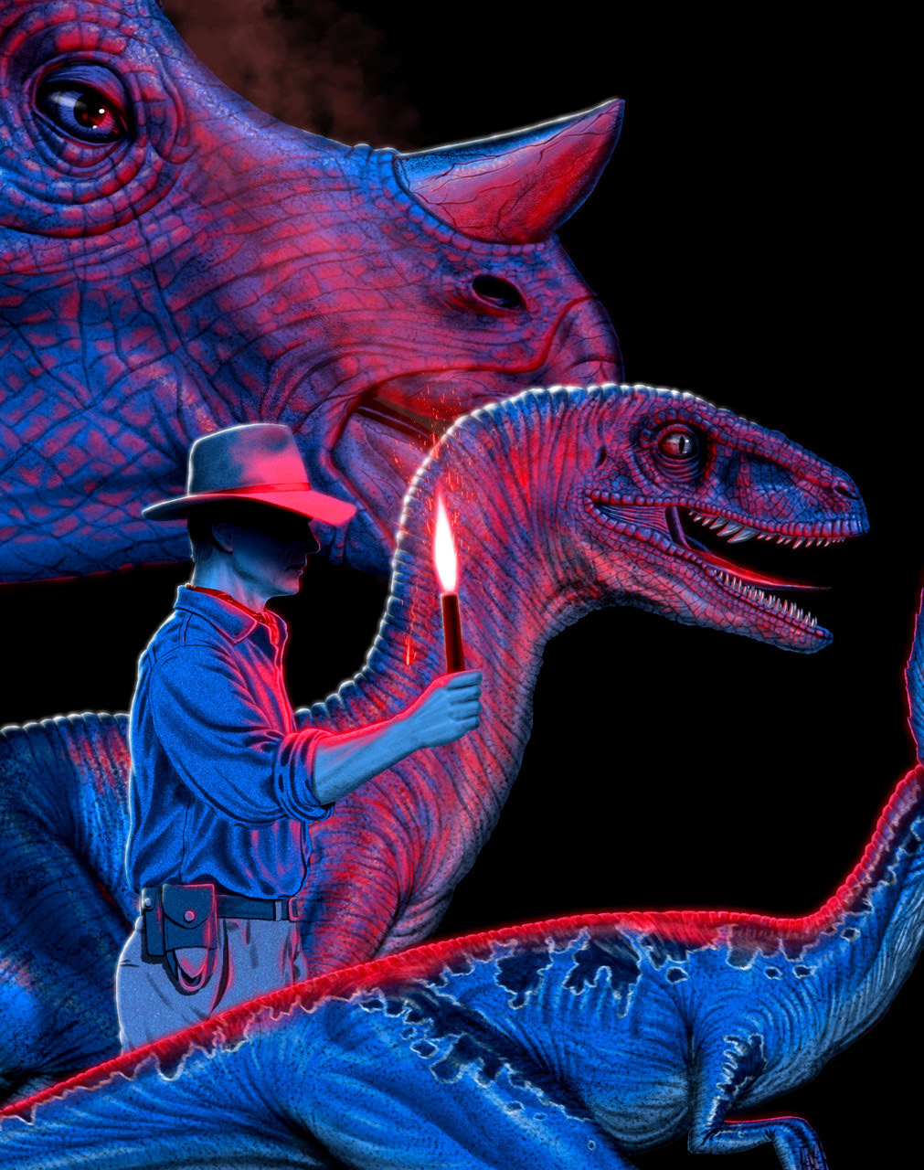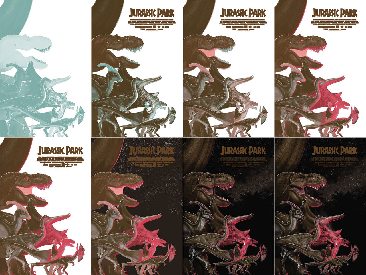 My officially licensed Jurassic Park screen printed poster 24x36″ edition of 175, variant 75 on sale tomorrow 1/6/22 at https://bottleneckgallery.com/ in partnership with Vice Press. After over a year of hiccups and approvals and well over 100 hrs of work this poster is roaring onto the scene. I was 12 when Jurassic Park was released and it blew my socks off. I wanted to make the Jurassic Park size comparison poster that I always wanted that was beyond just clinical silhouettes. The sizes are all accurate to the 1993 movie. IRL Dilophosaurus was 20ft long, Velociraptors were the size of big turkeys, more factoids abound. Did you know only 7 dinos appeared in the 1993 movie? Brachiosaurus, Gallimimus, Parasaurolophus, Triceratops, Tyrannosaurus round out the bunch. An insane amount of research and photo research went into this, I even bought Jurassic World Evolution to take screenshots “for research”. Screen printed by VG Kids. (If only you could see the idea we liked that got rejected!