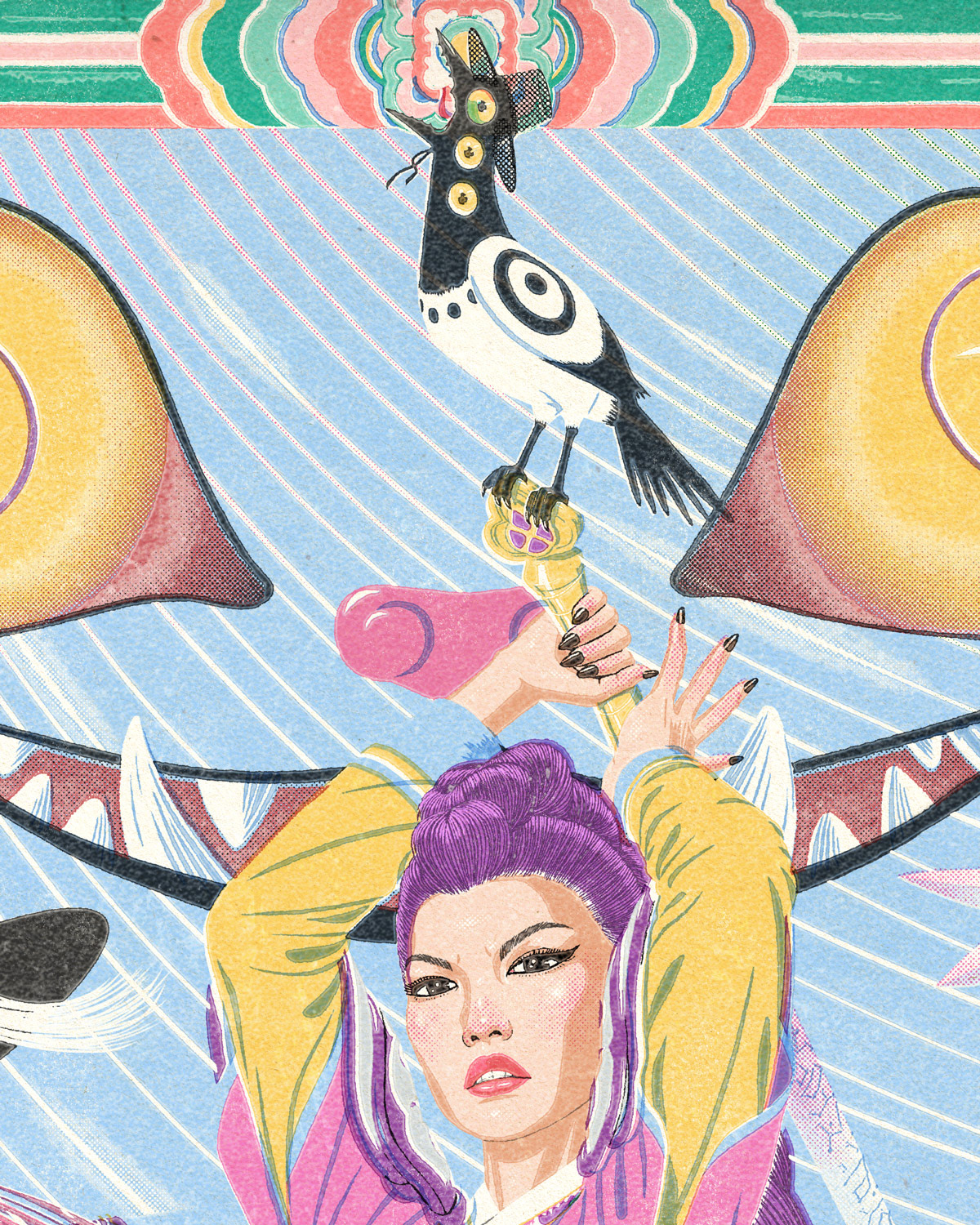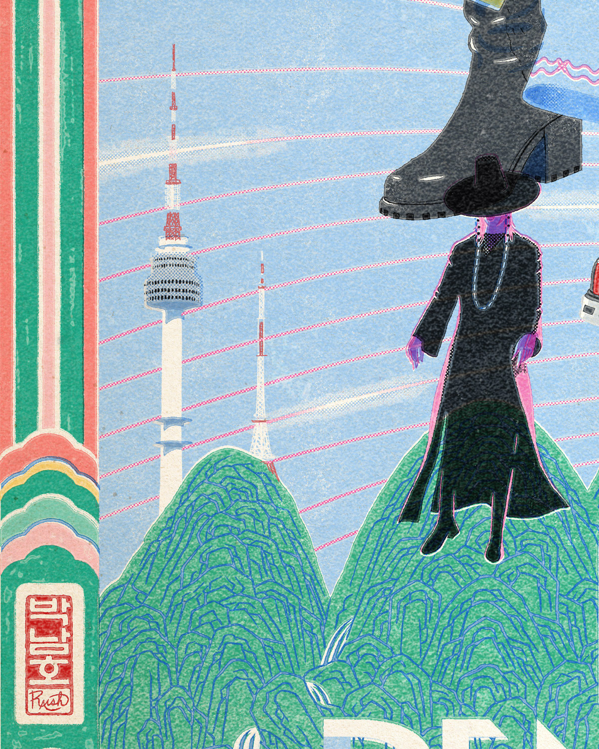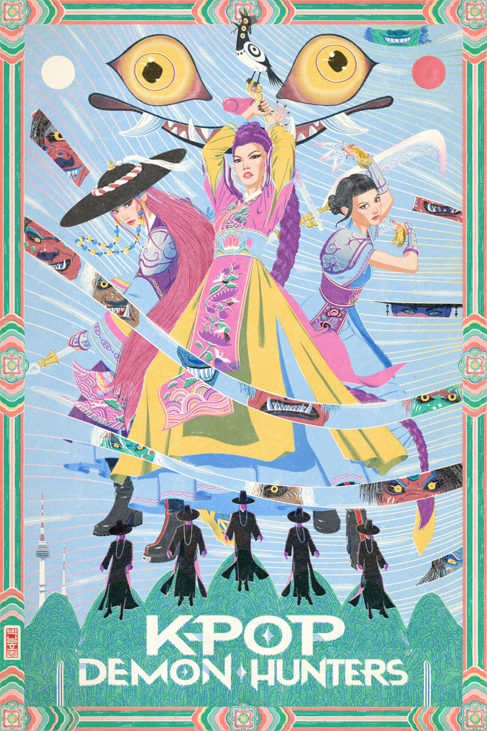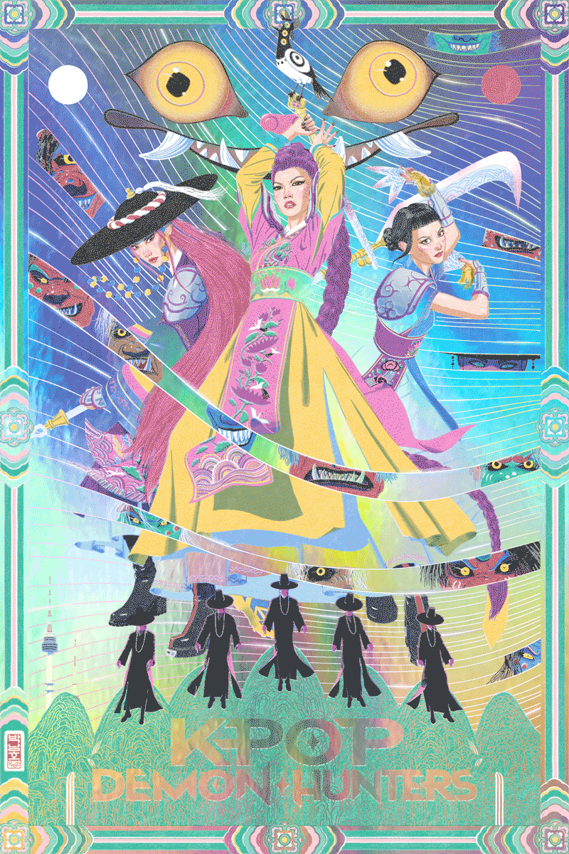 The OG demon hunters in K-pop Demon Hunters were female shamans from the Joseon period, called Mudang, who used music and dance to create the first Honmoon protective barrier. The demon hunter through-line is shown as Rumi, Mira, and Zoey wear the traditional Mudang clothing with their modern hairstyles and footwear. Tradition meets modernity, shaman song and dance meets K-pop. I'm so happy for everyone who was involved in making the movie but with every successful thing that makes Korean culture cool, I feel a pain in my heart for that Korean kid who grew up in western New York state where it was absolutely not cool to be Korean. What if K-pop Demon Hunters and the whole Hallyu movement existed when I was a kid? Maybe I wouldn't have gone to sleep wishing I'd wake up a white person, maybe i'd have been proud to be Korean. Well, I am proud now, and I made this poster to celebrate with ya'll. Sing it loud. 24x36" screenprint and rainbow foil variant editions https://spoke-art.com/