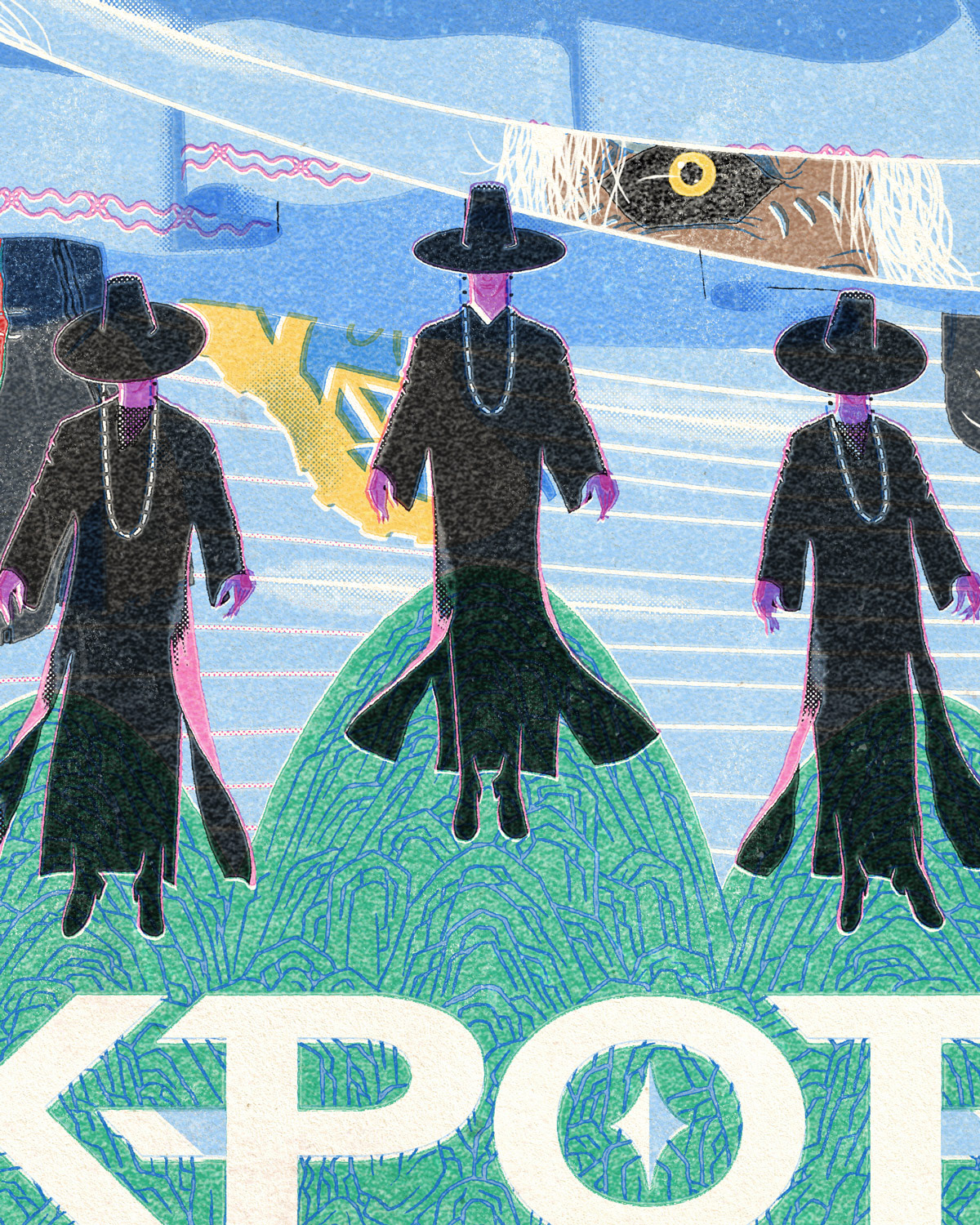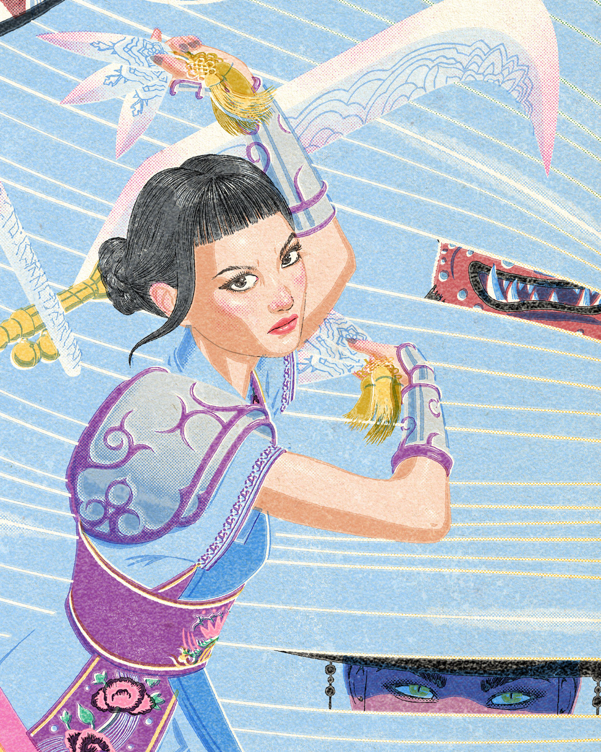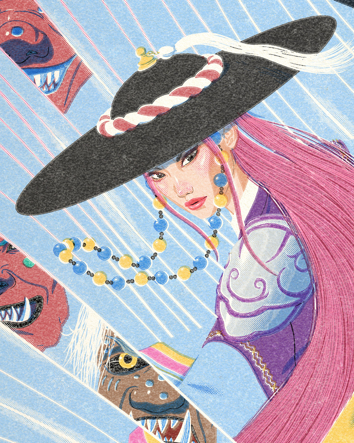 The OG demon hunters in K-pop Demon Hunters were female shamans from the Joseon period, called Mudang, who used music and dance to create the first Honmoon protective barrier. The demon hunter through-line is shown as Rumi, Mira, and Zoey wear the traditional Mudang clothing with their modern hairstyles and footwear. Tradition meets modernity, shaman song and dance meets K-pop. I'm so happy for everyone who was involved in making the movie but with every successful thing that makes Korean culture cool, I feel a pain in my heart for that Korean kid who grew up in western New York state where it was absolutely not cool to be Korean. What if K-pop Demon Hunters and the whole Hallyu movement existed when I was a kid? Maybe I wouldn't have gone to sleep wishing I'd wake up a white person, maybe i'd have been proud to be Korean. Well, I am proud now, and I made this poster to celebrate with ya'll. Sing it loud. 24x36" screenprint and rainbow foil variant editions https://spoke-art.com/