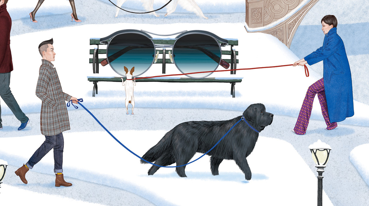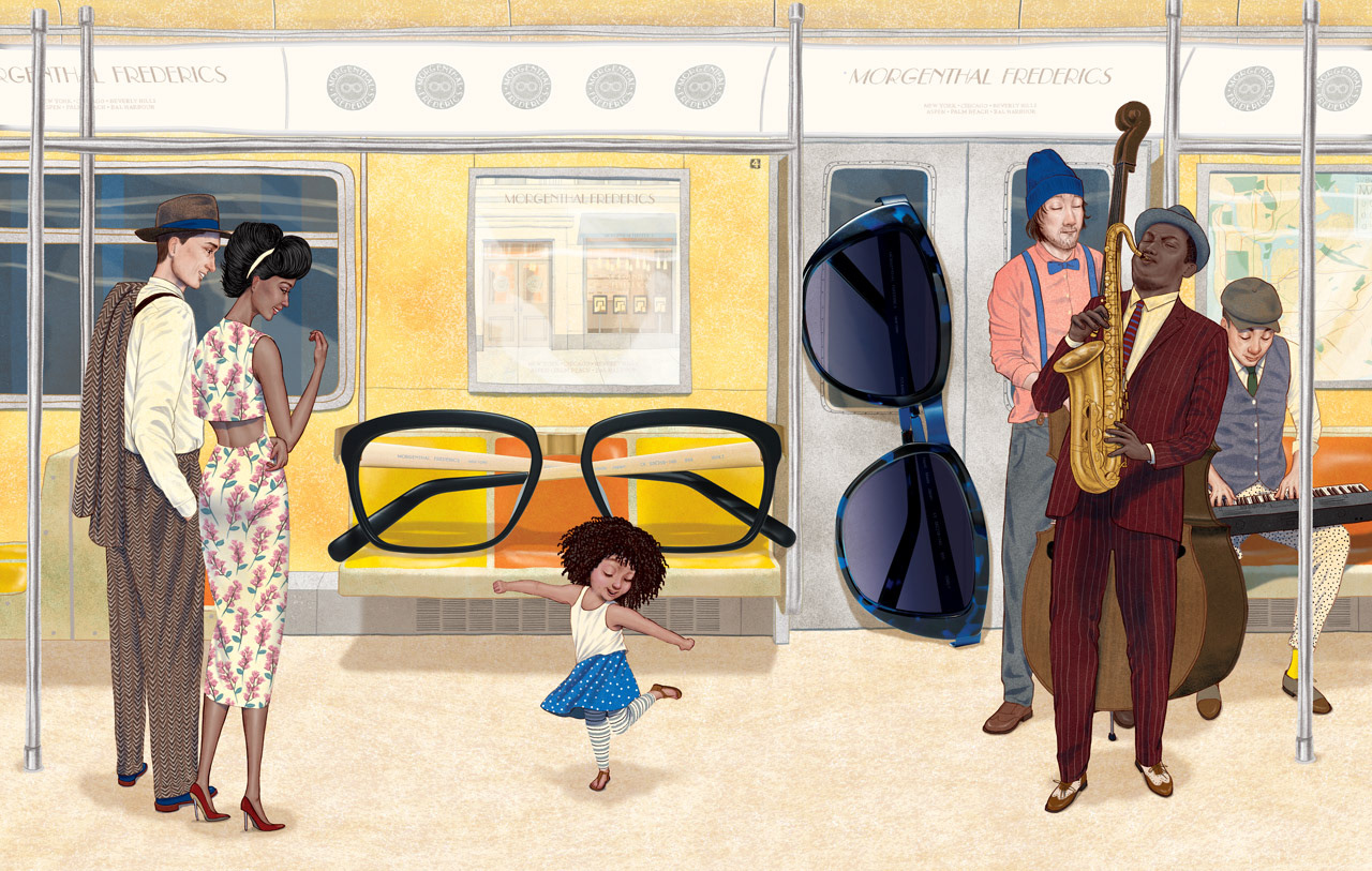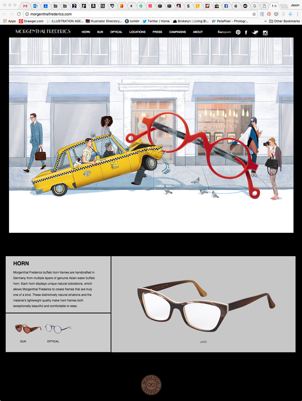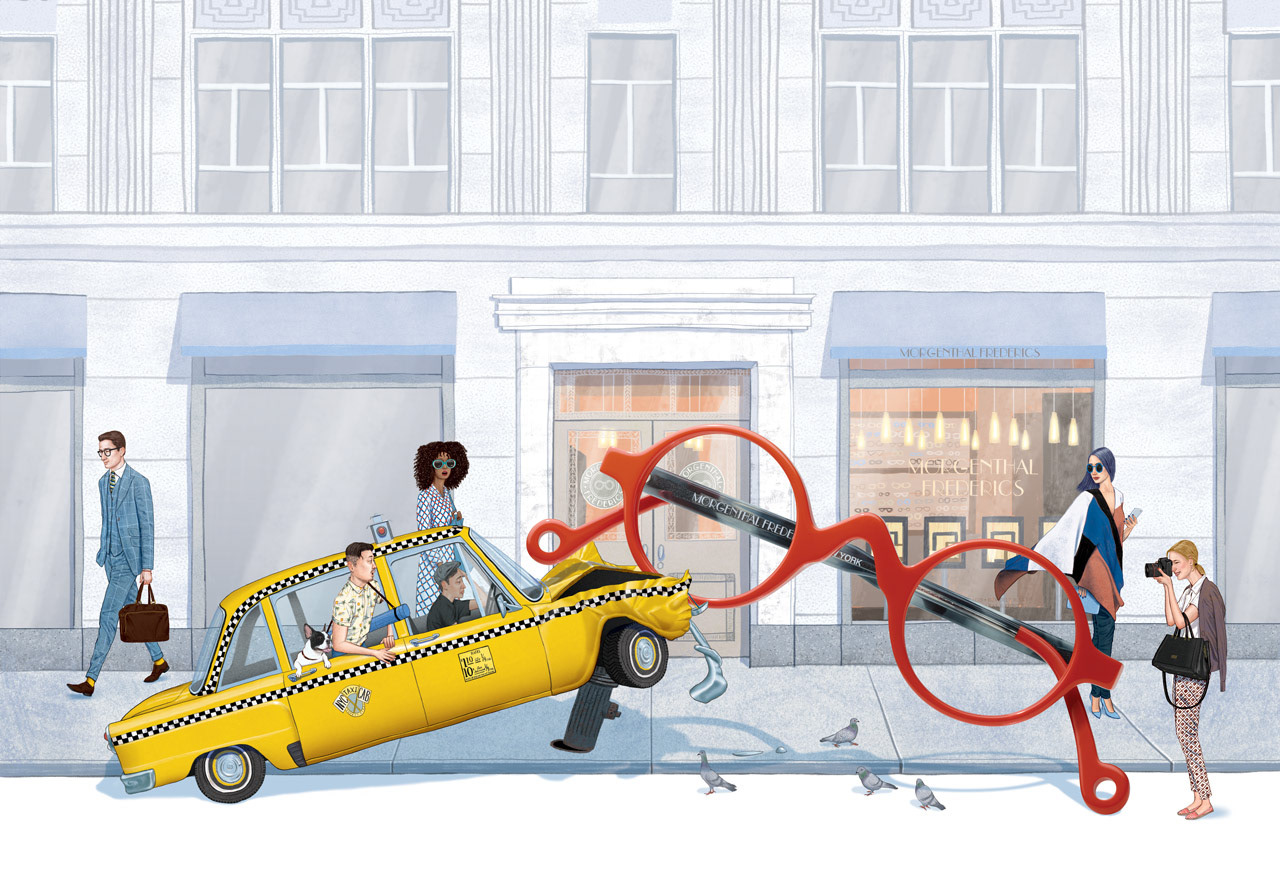 “30 Years of Signature Style”, Luxury eyewear brand Morgenthal Frederics’ 30th anniversary fall advertising campaign. As a New York City brand they wanted scenes around NYC. Photography and art direction by Chris Chieco. I did a total of 8. Most of these are big 36"x36" and took about 60 hours each. A killer workload but I am still alive. It was used for in-store displays, window displays, huge window banners, holiday cards, website, social media, and magazine print ads. Series selected for the 59th annual Society of Illustrators show (Jan 4 - Jan 28th 2017). And talk about luxury some of the frames are $2,000+!