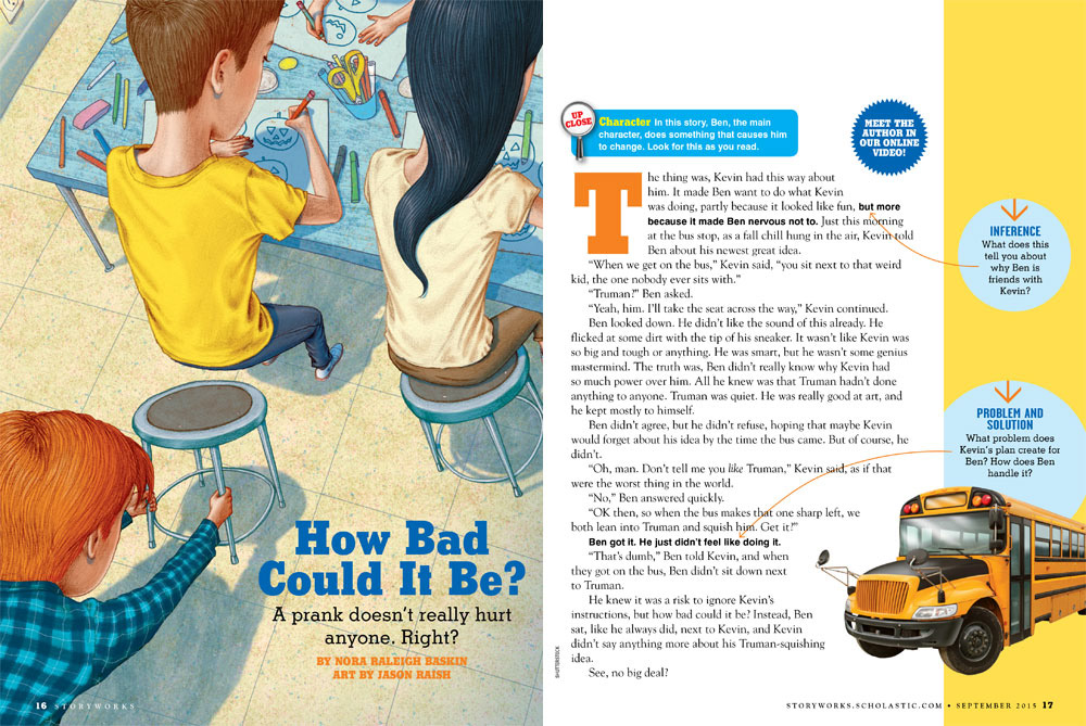 Full page for Scholastic’s Storyworks classroom magazine about a prank gone wrong. In the story the kid ends up with a bloody nose and the reader learns a few morality lessons.