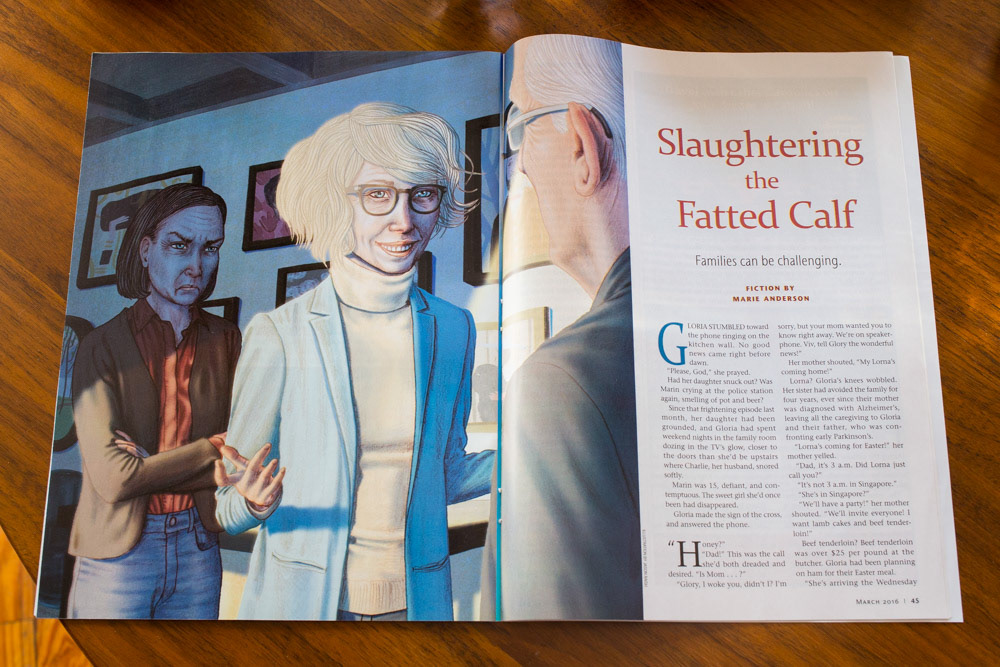 A prodigal daughter story for St Anthony’s Messenger about a younger less responsible sister who returns home to a hero’s welcome whilst the older responsible daughter caring for the parent’s is chastised for being a party pooper.