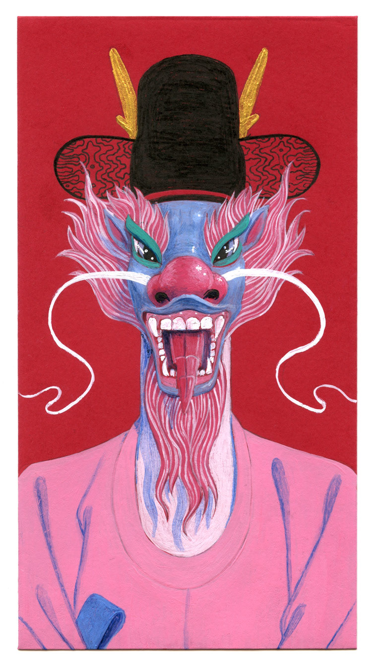 "Yangban Dragon" is inspired by a nobleman portrait I saw at the National Gallery in Seoul. 3.5x6.5" acylic painting on red Chinese new year paper envelope.