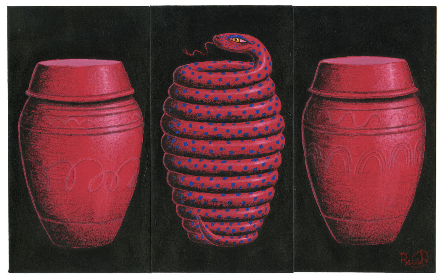 Snake onggi triptych in acrylic and colored pencil on Chinese Lunar new year red envelopes for the Grumpy Bert 10th annual Red Envelope show with Harman Projects. 10.5" x 6.5" SOLD. In the old days in Korea it was good luck to find a snake in your house as they are a symbol of abundance and protectors of wealth and health. Onggi pots for fermenting and storing kimchi are made using the coiling method, similar in appearance to a coiled snake. May the snake protect your abundance of kimchi to make it through the winter!