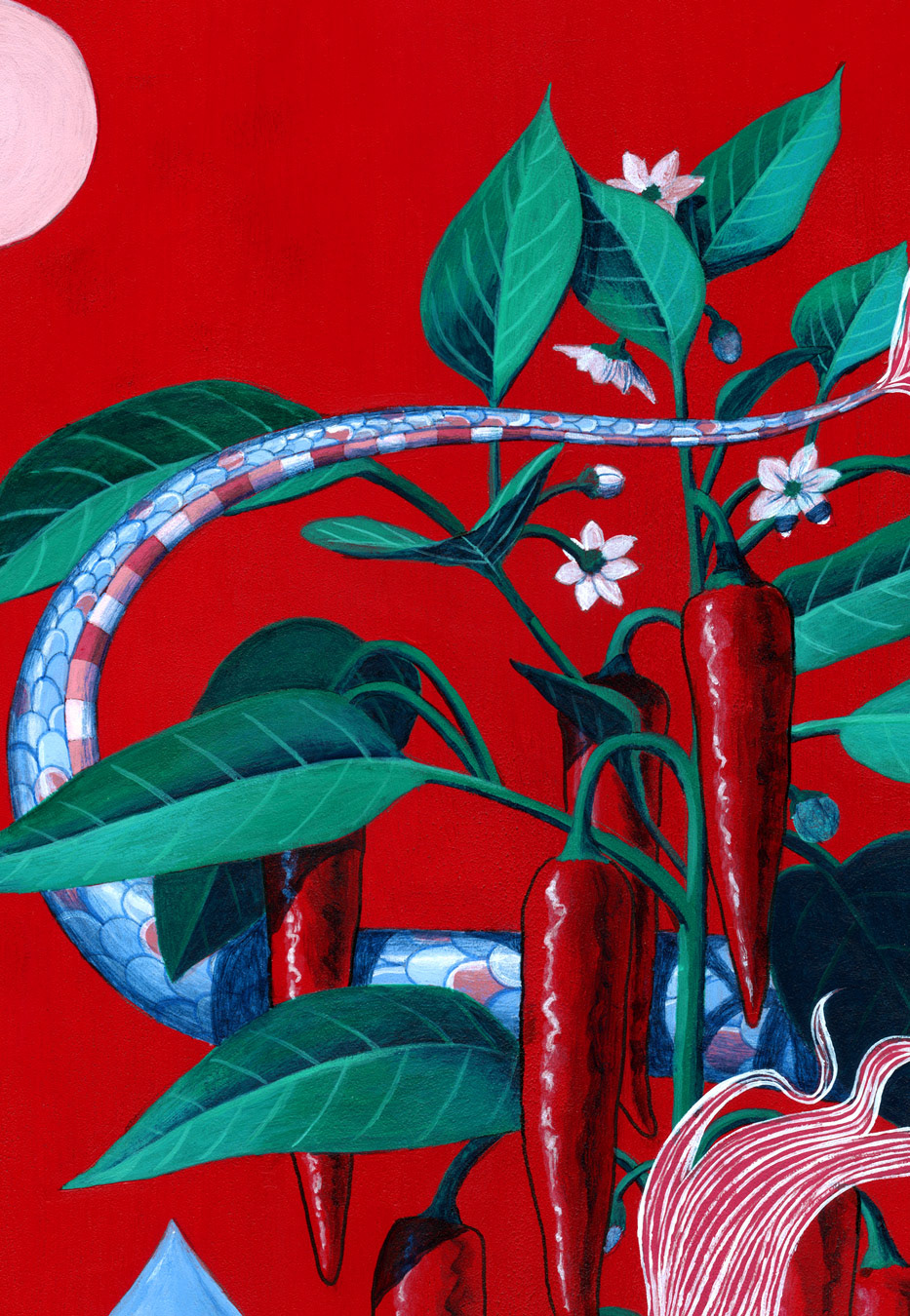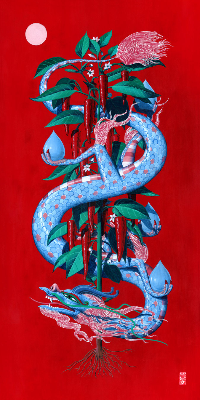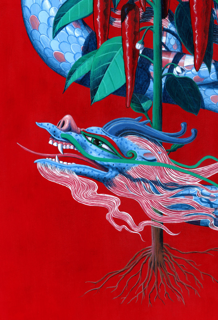 Dragons are associated with agriculture and rain and the show has a red theme so it seemed natural to paint the Korean heirloom peppers I grow on our roof every year.