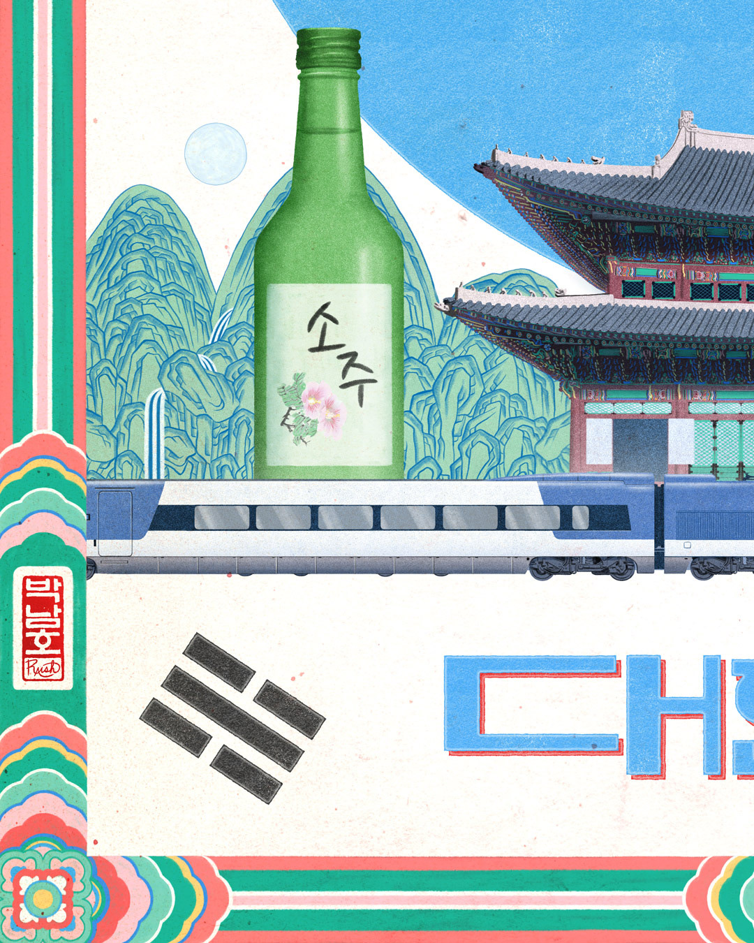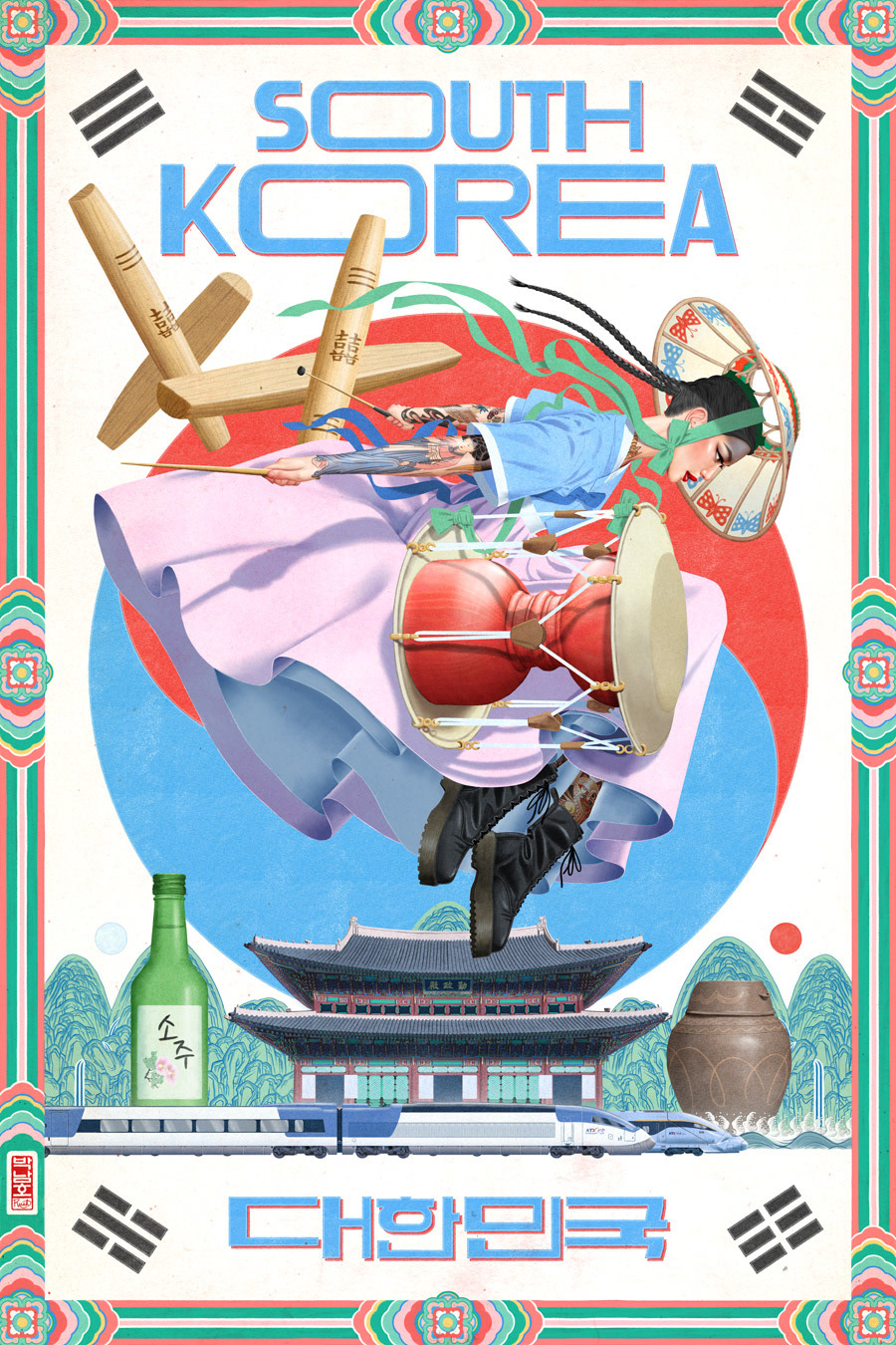 South Korean travel poster inspired by my many travels to the country. I was born there, studied abroad at Yonsei University in Seoul in 2001, and have been back many times and am always inspired but never do anything with that inspiration until this time. 24x36" Thanks for looking and reading 감사합니다! buy the poster here https://society6.com/product/south-korea-travel-poster8684120_print?sku=s6-27985504p4a1v3