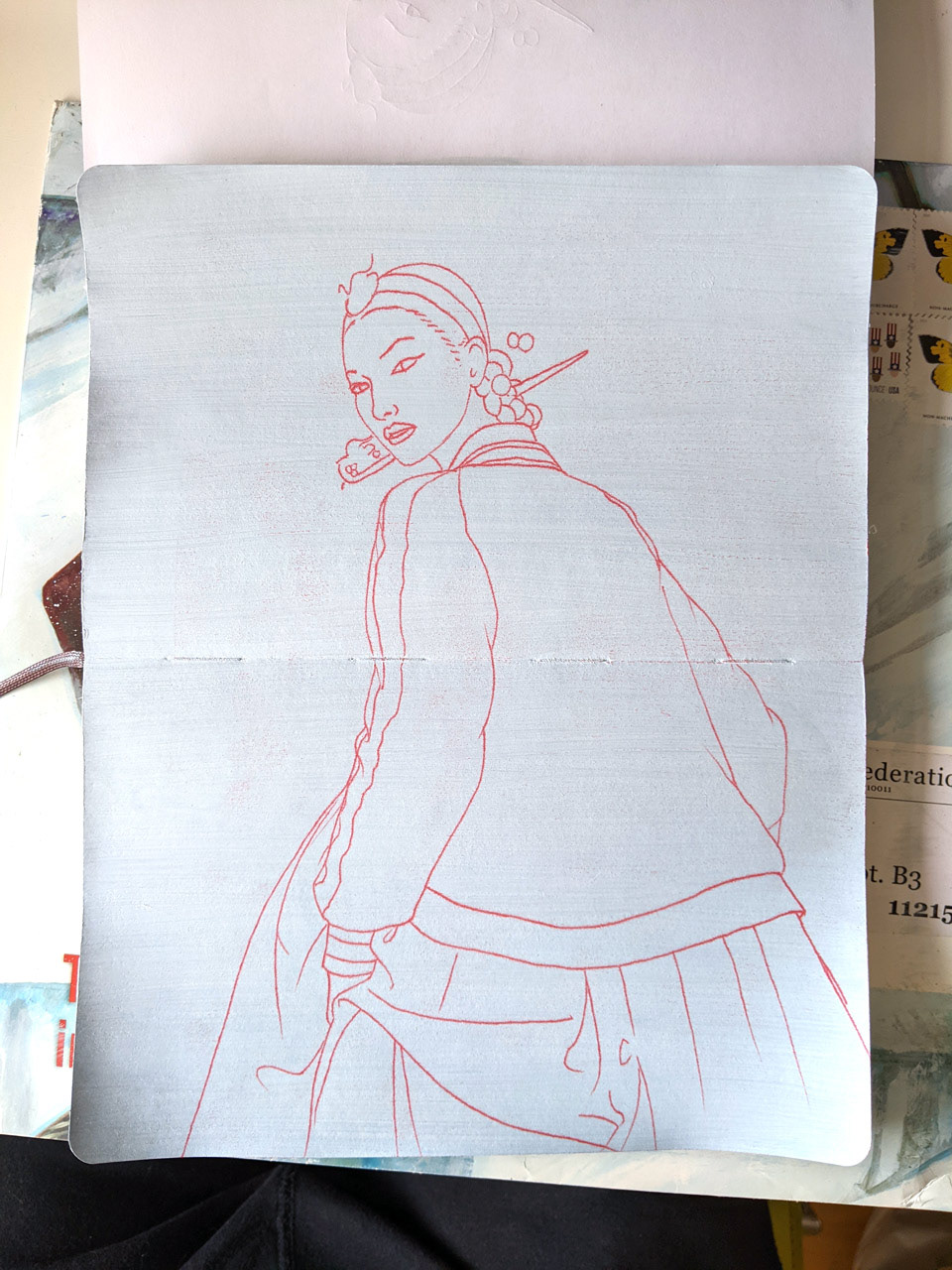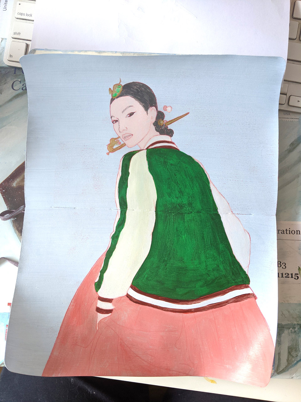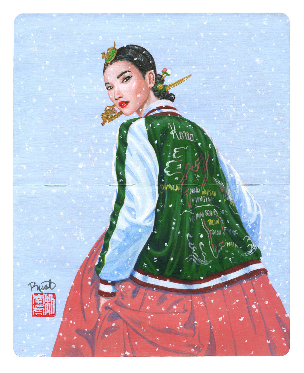 Painting for Spoke Art’s 10th annual Moleskine group show. "Souvenirs” 8.25" x 10.25"; framed: 12.75" x 14.75", Acrylic and ink on moleskine paper 2021 Souvenir jackets appeared in post WWII Asia as soldiers would have the places they served and various slogans mixed with Asian imagery embroidered onto reused parachute silk jackets to take home as "souvenirs". This tradition continued in the post war eras of other Asian conflicts like the Korean War. Although thankful for the help, the military occupation of S Korea came with downsides, including inheriting a comfort woman scheme from the Japanese occupation. It's East meets West, Traditional meets Modern, Joseon dynasty hair pins and Hanboks meets American G.I., but there's history in these jackets born from the ashes of conflict and complex feels of all kinds. On view at Spoke Art in San Francisco from June 5th - 26th, 2021 https://spoke-art.com/collections/the-moleskine-project/products/jason-raish-souvenirs