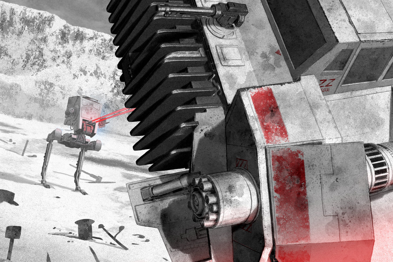 On Sale tomorrow Dec 12th at 12pm noon EST at https://bottleneckgallery.com/ officially licensed 36x24" poster: Ground Assault. Hand numbered silkscreened edition of 225, Black and White Variant edition of 125, 3D Lenticular Plex edition of 50, 3D Lenticular Plex Variant edition of 50. As a kid I was completely amazed by the Battle of Hoth and as an adult researching and seeing how they made it I am completely amazed again. Trap doors opening up in the snow on the miniature set so the modelers can move stop motion parts around? Amazing. Factoid: in ESB the "eye" port doors on the AT-ST were closed and in ROTJ they opened them. When you spend 100 hours drawing/rendering/detailing these designs you gain a unique appreciation for them. They are as great today as they ever were.