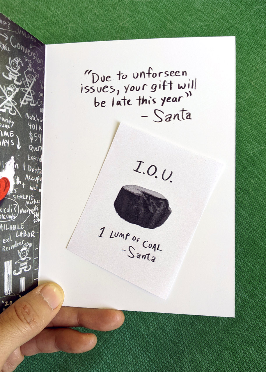 Now that my 12 years of Japanese new years Asian zodiac cards series is done I’m going back to Christmas themed cards. Everyone has supply chain problems this year, including Santa. The interior says “Due to unforseen circumstances your gift will be late this year”, and then out falls a note that says I.O.U. (I owe you) 1 lump of coal - Santa. At the top of the chalkboard are coal supply chain terms which is a hint that everything on the board is to deliver your gift wrapped lump of coal, even the sharpie marker to write your name with (factories in Mexicali and Maryville TN). Happy Holidays one and all!