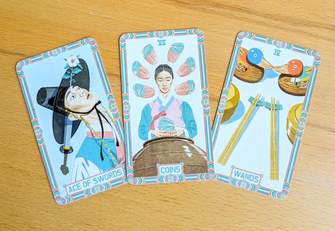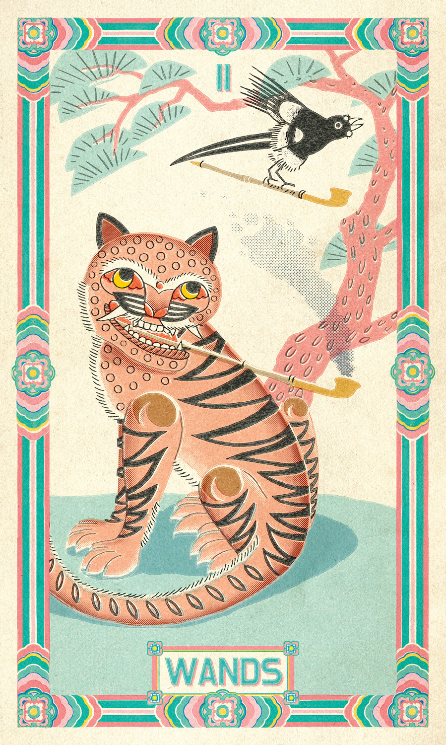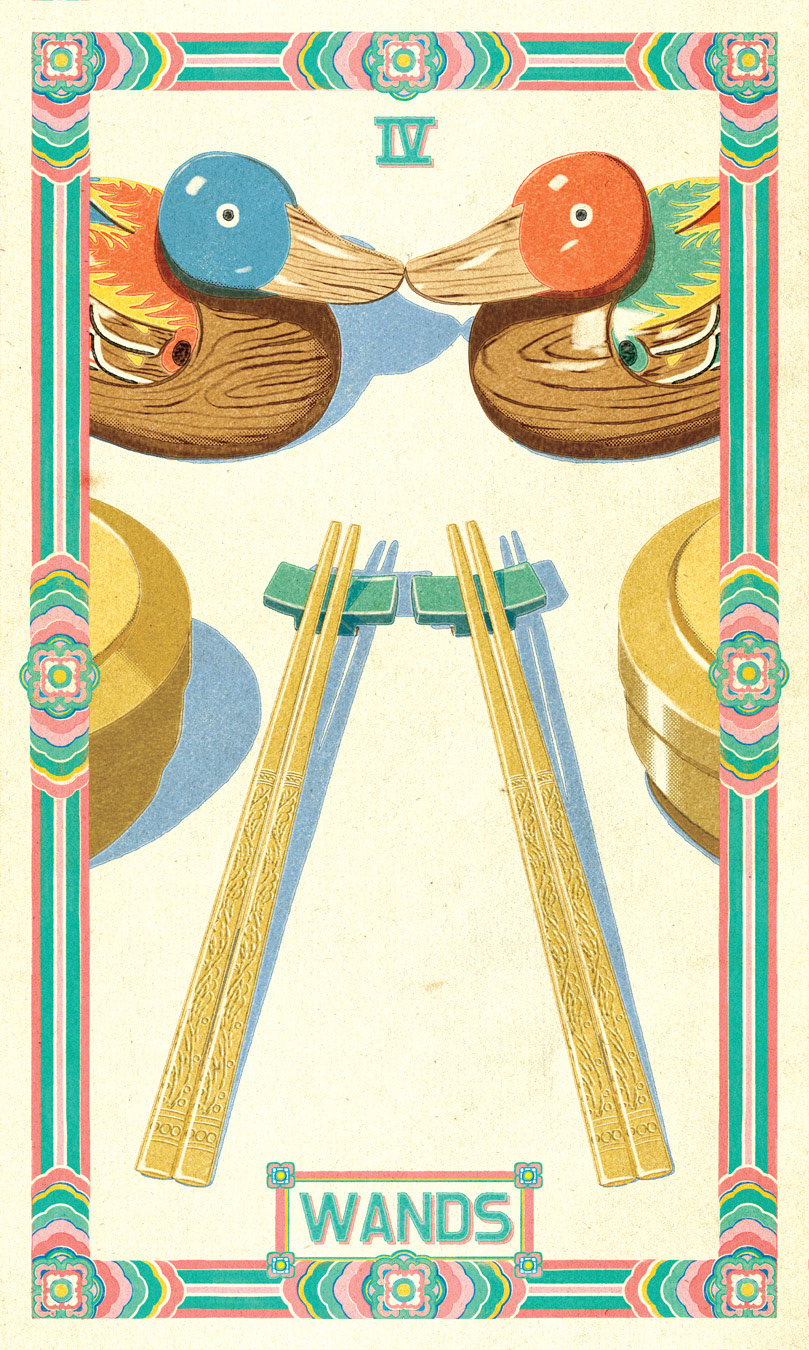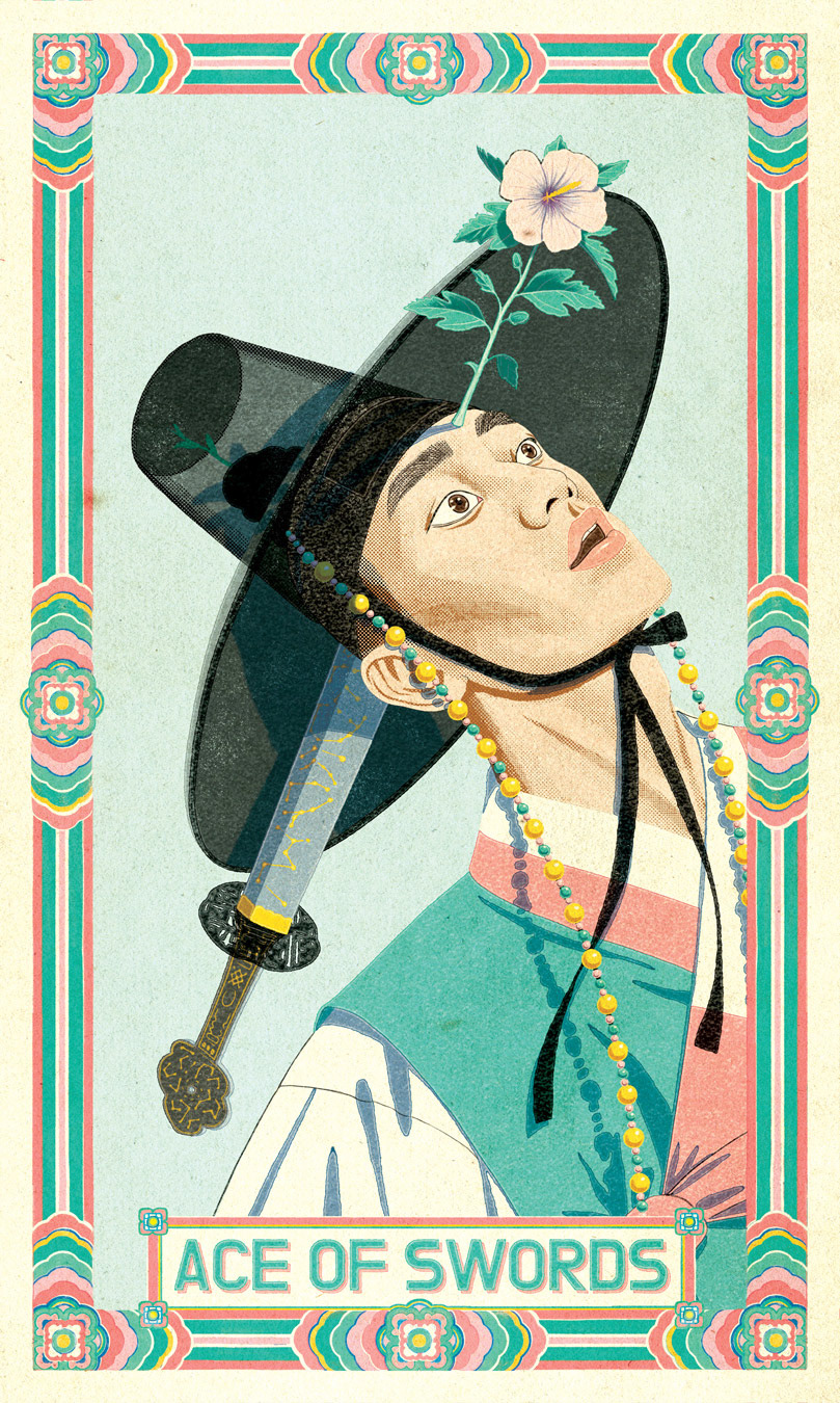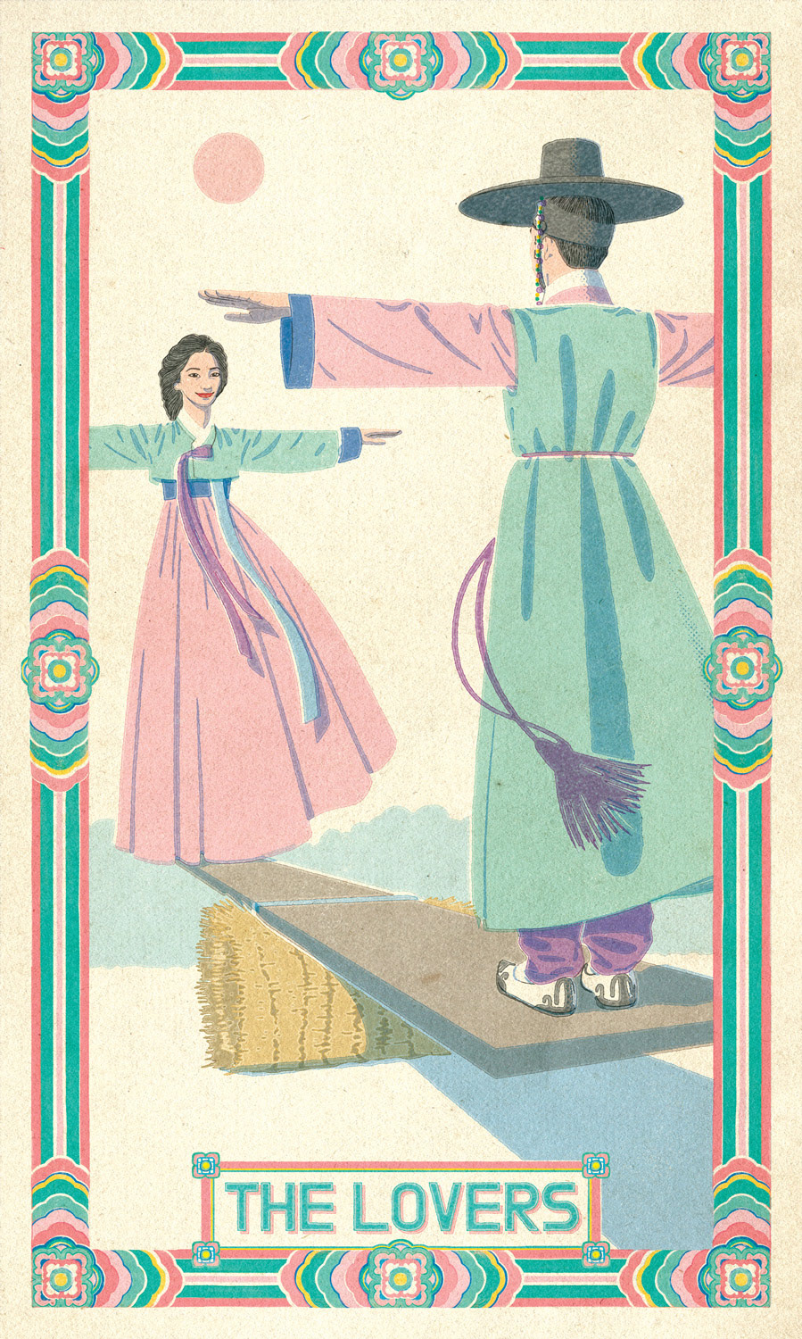 Tarot cards I had to make so my Fashion Institute of Technology sophomore illustration class I teach could make a complete 78 card deck. I chose a traditional Korean culture theme. Ace of Swords: new thoughts or ideas arriving that change the course of your life, clarity, truth, inspiration, raw and undeniable power. 7 of Coins: Investments, planning, patience, the beginning of something that will grow, long-term goals, commitment, stability, building a strong foundation. (all of these things are in kimchi making) 4 of Wands: Marriage, home building, aligning with your path and purpose, connecting with the right people, a sense of belonging, matching the frequency of what you want in life, alignment. (wooden ducks given at Korean weddings) The Lovers: partnership, balance of 2 things together, unity, duality, commitment 2 of Wands: Partnership, letting go of the past in order to move ahead with a new decision, collaboration, forward movement, leaving something behind Knight of Wa