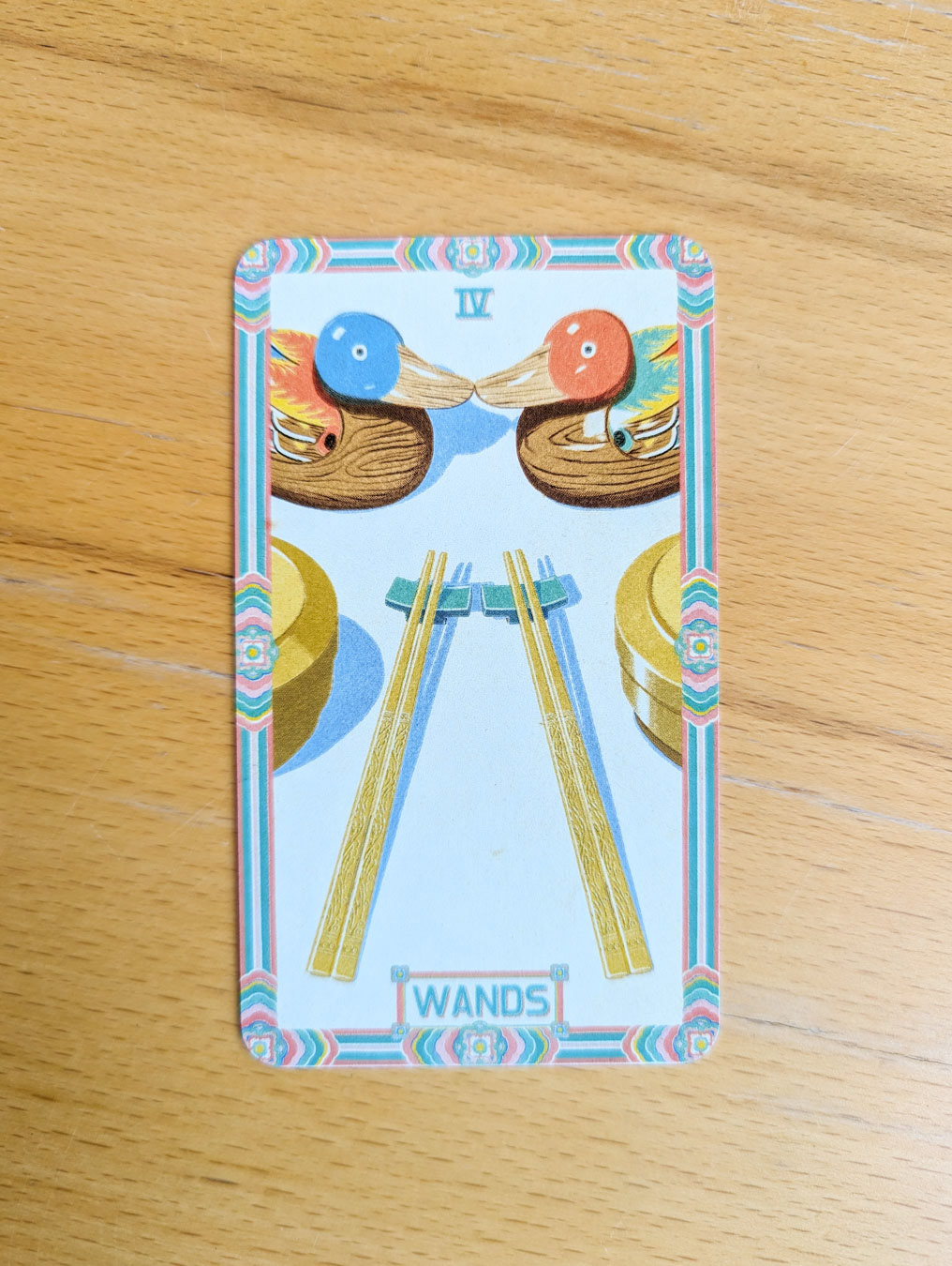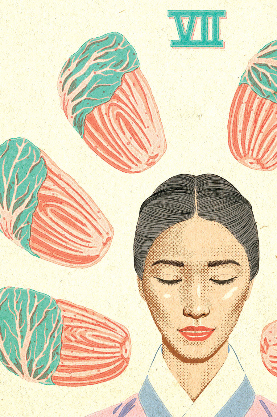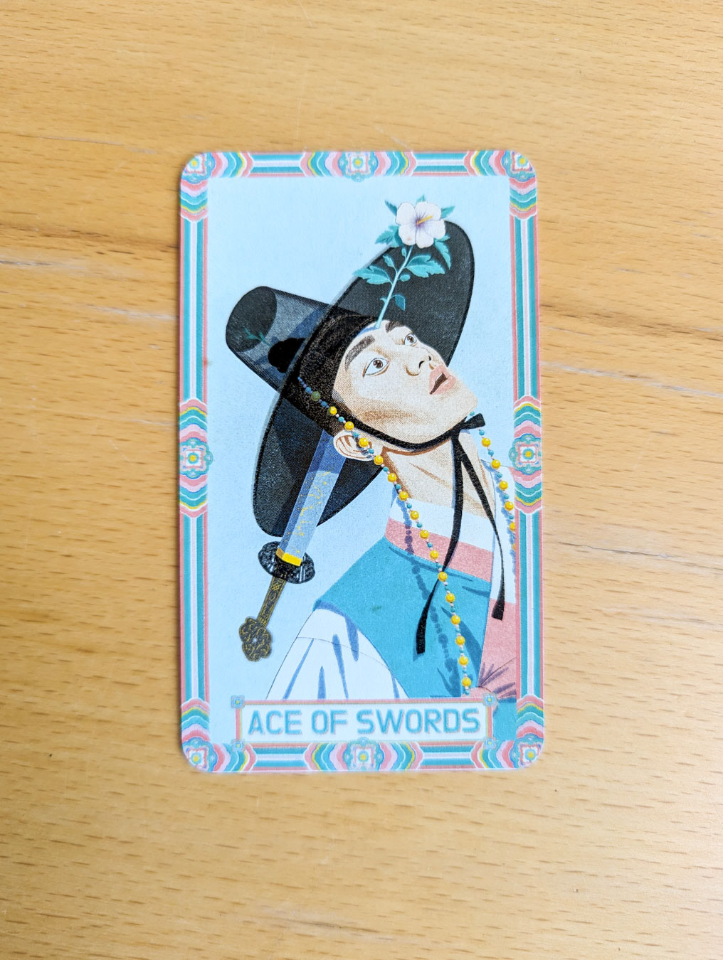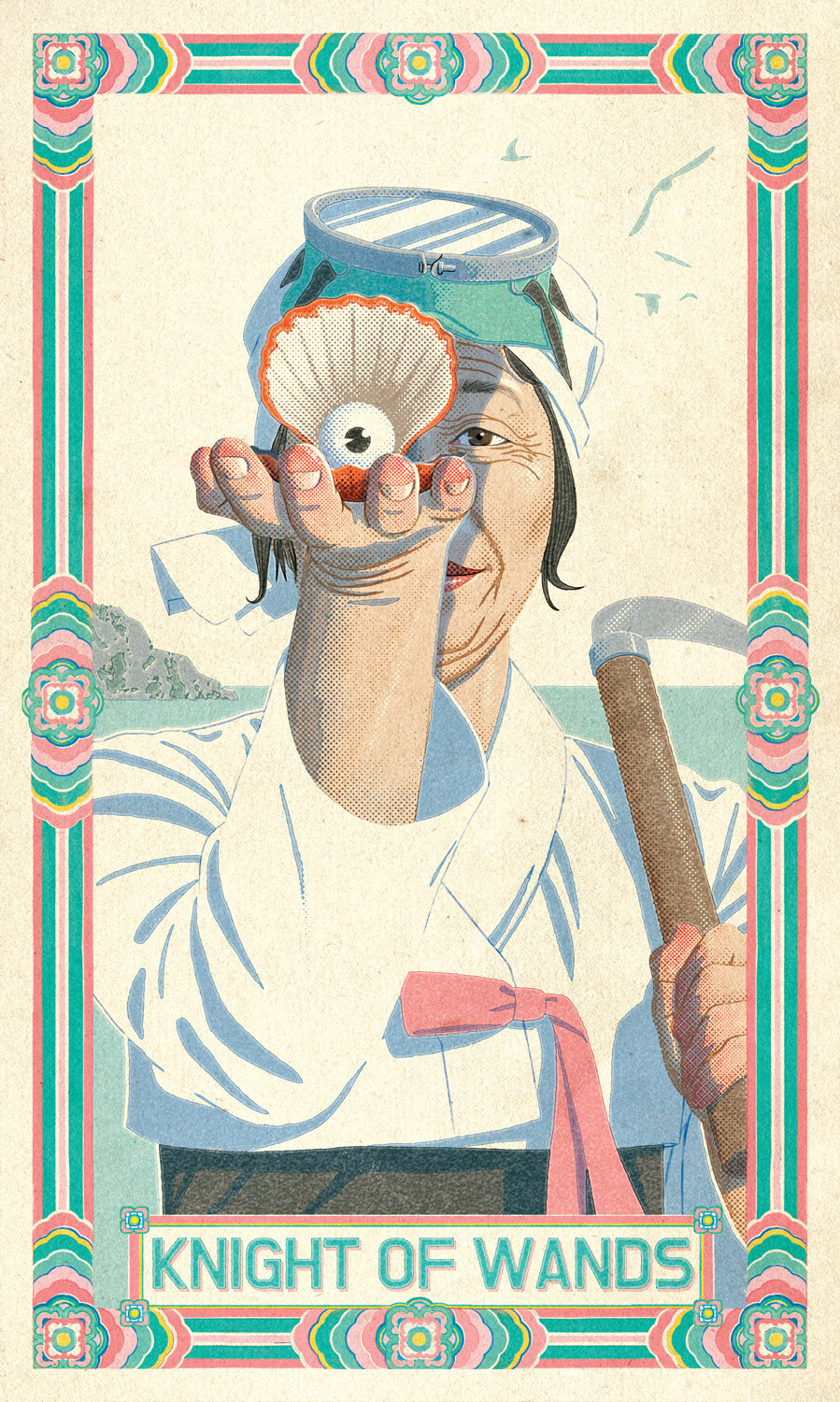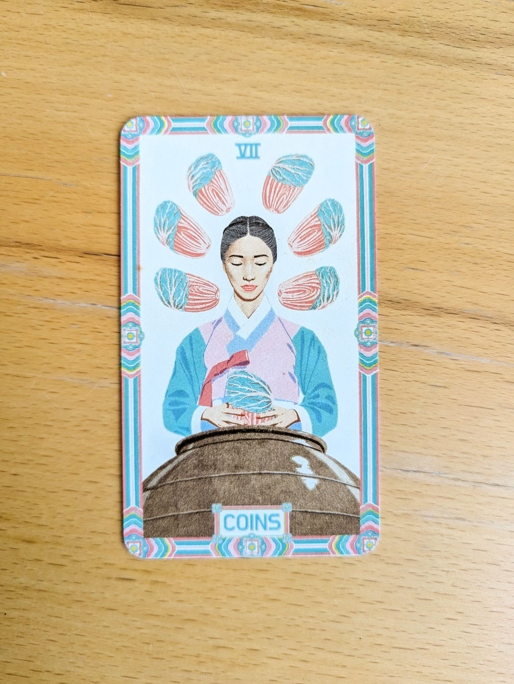 Tarot cards I had to make so my Fashion Institute of Technology sophomore illustration class I teach could make a complete 78 card deck. I chose a traditional Korean culture theme. Ace of Swords: new thoughts or ideas arriving that change the course of your life, clarity, truth, inspiration, raw and undeniable power. 7 of Coins: Investments, planning, patience, the beginning of something that will grow, long-term goals, commitment, stability, building a strong foundation. (all of these things are in kimchi making) 4 of Wands: Marriage, home building, aligning with your path and purpose, connecting with the right people, a sense of belonging, matching the frequency of what you want in life, alignment. (wooden ducks given at Korean weddings) The Lovers: partnership, balance of 2 things together, unity, duality, commitment 2 of Wands: Partnership, letting go of the past in order to move ahead with a new decision, collaboration, forward movement, leaving something behind Knight of Wa