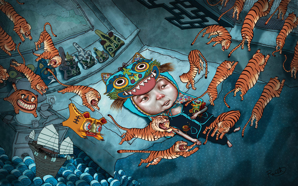 Client: Tiger Beer (via Kult Agency) I was invited to be a part of the "Tiger Translate" artist series that they have every so often. This piece is 3 feet by 2 feet. The theme was Change/Society. This piece is about losing culture.