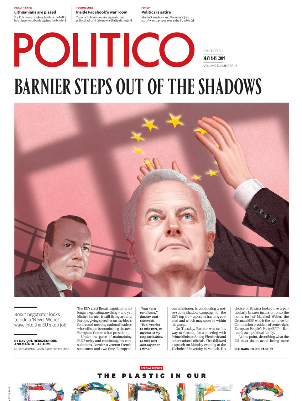 Front page of Politico, Brexit negotiator Michel Barnier looks to ride a “Never Weber” wave into the European Commission presidency. For Politico Europe