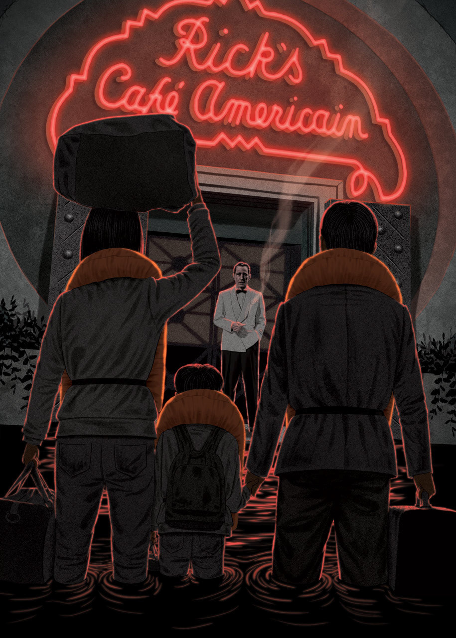 The classic film Casablanca is more relevant today than it ever was. Themes of aliens in flux, trigger-happy law enforcement and intimidating political regimes. Written by my new pal James Charisma out in Hawaii. 3 full page illos. Follow the story in Beneficial Shock! issue 4: War & Peace now in stores and available online. It’s a fantastic UK based magazine for film lovers and design enthusiasts co-created by my pal and illustrator Phil Wrigglesworth whom I met when I lived in London 7 years ago.