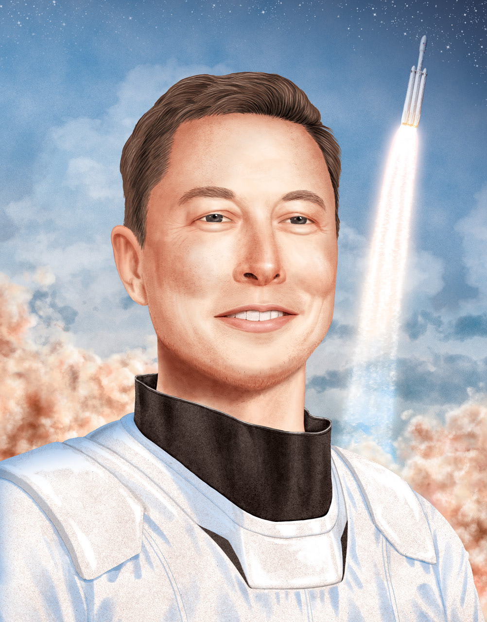 Elon Musk, wearing SpaceX's prototype flight suit with the Falcon Heavy rocket in the background.