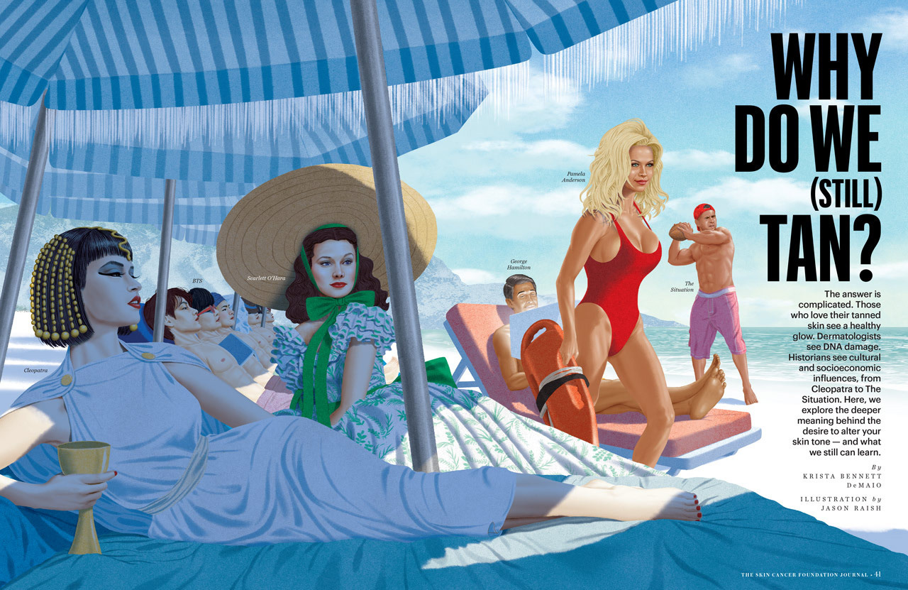 Why Do We (Still) Tan?. Double page spread for Skin Cancer Foundation magazine. Thanks Priest and Grace for working with me. Those who love their tanned skin see a healthy glow. Dermatologists see DNA damage. Historians see cultural influences, from Cleopatra, BTS and Scarlett O’Hara to George Hamilton, Pamela Anderson and The Situation.