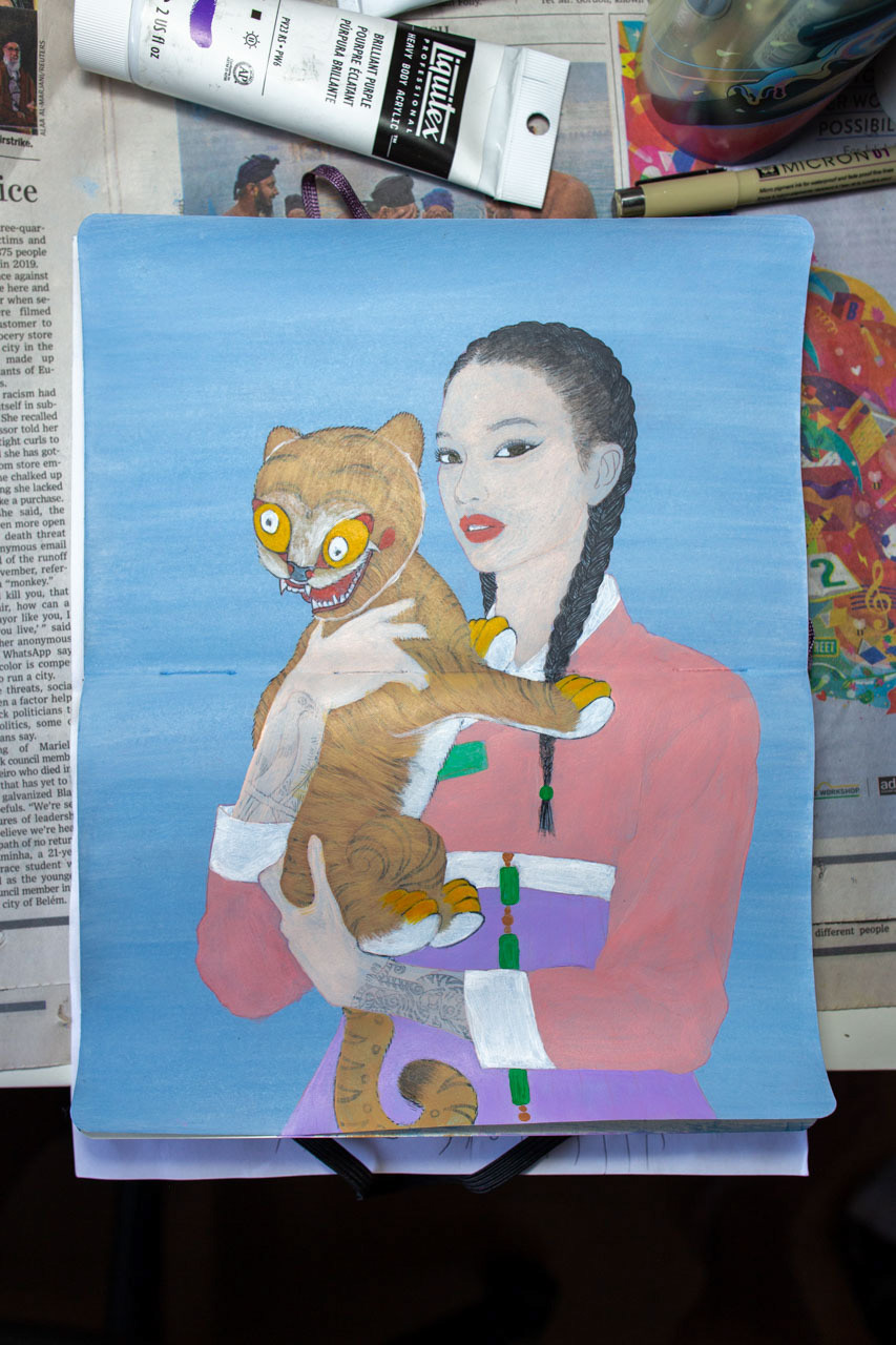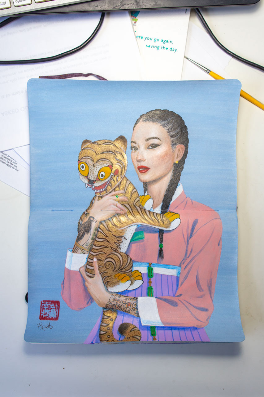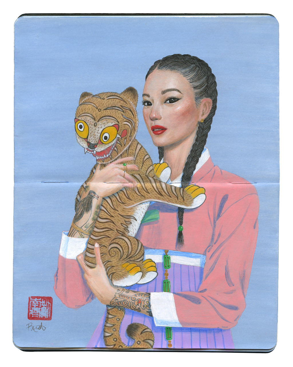 Painting for Harman Project’s Moleskine group show at The Mesa Arts Museum in Arizona. Sept 9 - Dec 4, 2022 “Wonky Eyes And All” 8.25” x 10.25"; framed: 12.75" x 14.75", Acrylic and ink on Moleskine paper 2022 Every culture has it’s good and bad parts. In Korean culture jeong 정 (a kind of the warm feelings arising one’s relationship with another person) is a beautiful one. But it also has its bad parts, the sharp teeth and claws of misogyny and machismo (similar in many cultures). I was inspired by old Minhwa folk paintings of tigers that look a little weird but are endearing at the same time. Will you embrace your culture? Sharp teeth, wonky eyes, and all? The Magpie and the Tiger is one common theme of Minhwa paintings (the magpie is a tattoo on her). The tiger has some gold paint worked in so it’s iridescent.
