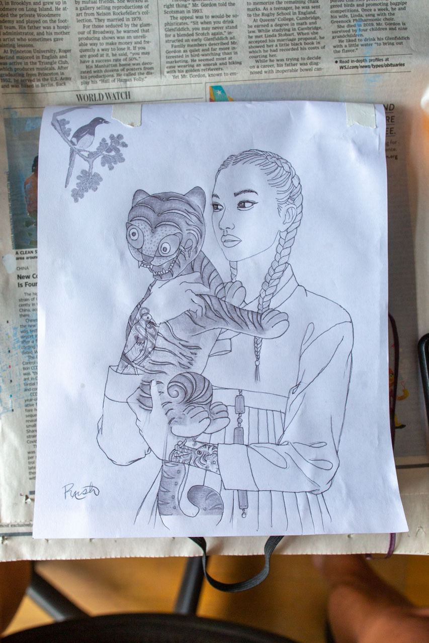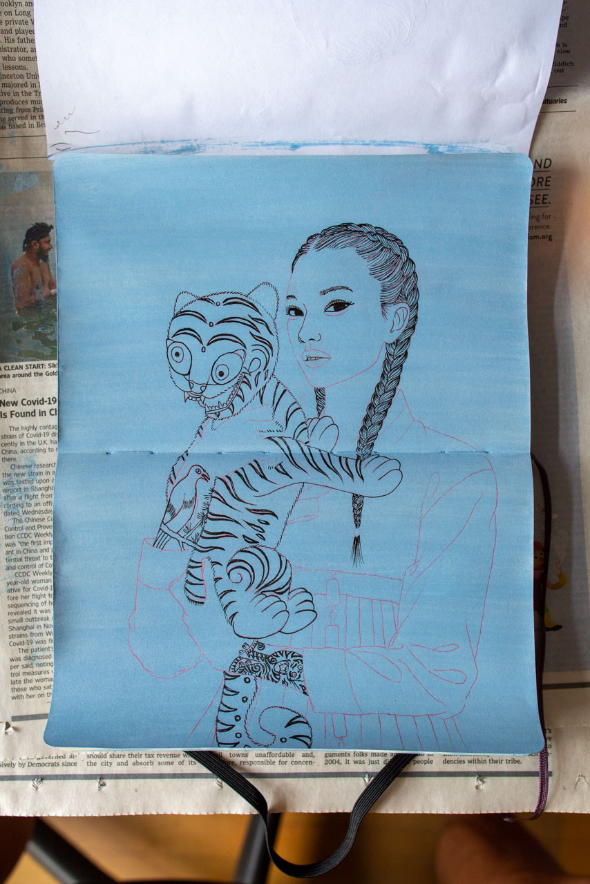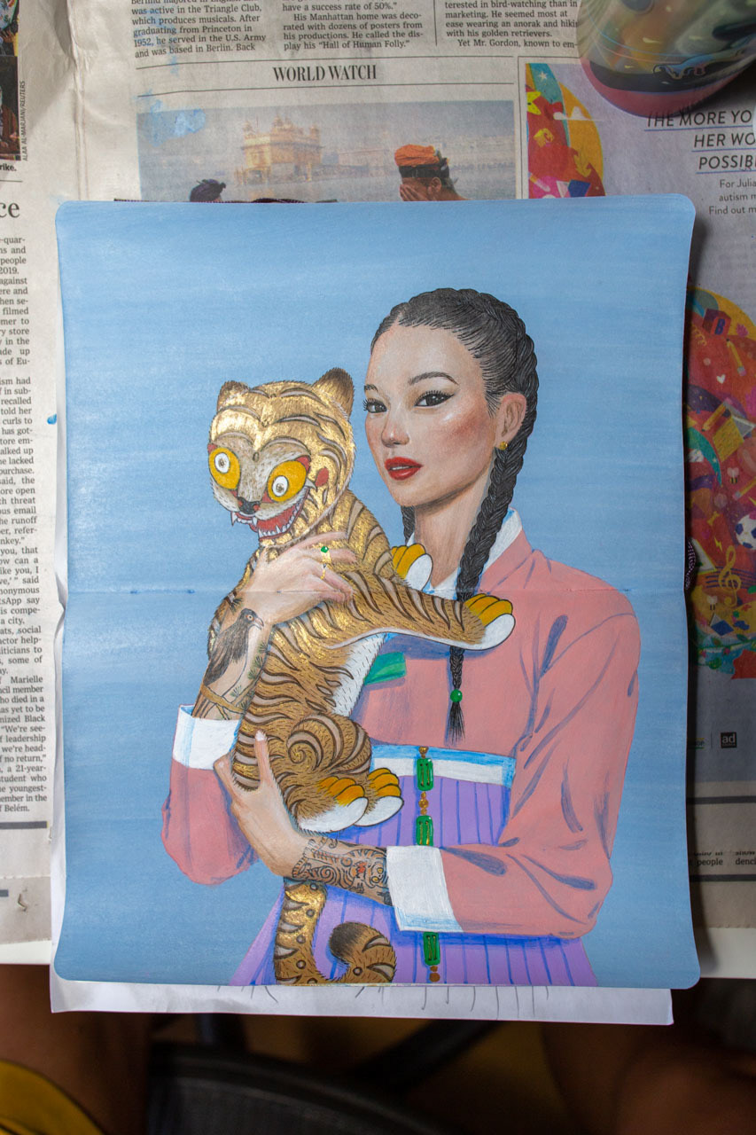Painting for Harman Project’s Moleskine group show at The Mesa Arts Museum in Arizona. Sept 9 - Dec 4, 2022 “Wonky Eyes And All” 8.25” x 10.25"; framed: 12.75" x 14.75", Acrylic and ink on Moleskine paper 2022 Every culture has it’s good and bad parts. In Korean culture jeong 정 (a kind of the warm feelings arising one’s relationship with another person) is a beautiful one. But it also has its bad parts, the sharp teeth and claws of misogyny and machismo (similar in many cultures). I was inspired by old Minhwa folk paintings of tigers that look a little weird but are endearing at the same time. Will you embrace your culture? Sharp teeth, wonky eyes, and all? The Magpie and the Tiger is one common theme of Minhwa paintings (the magpie is a tattoo on her). The tiger has some gold paint worked in so it’s iridescent.