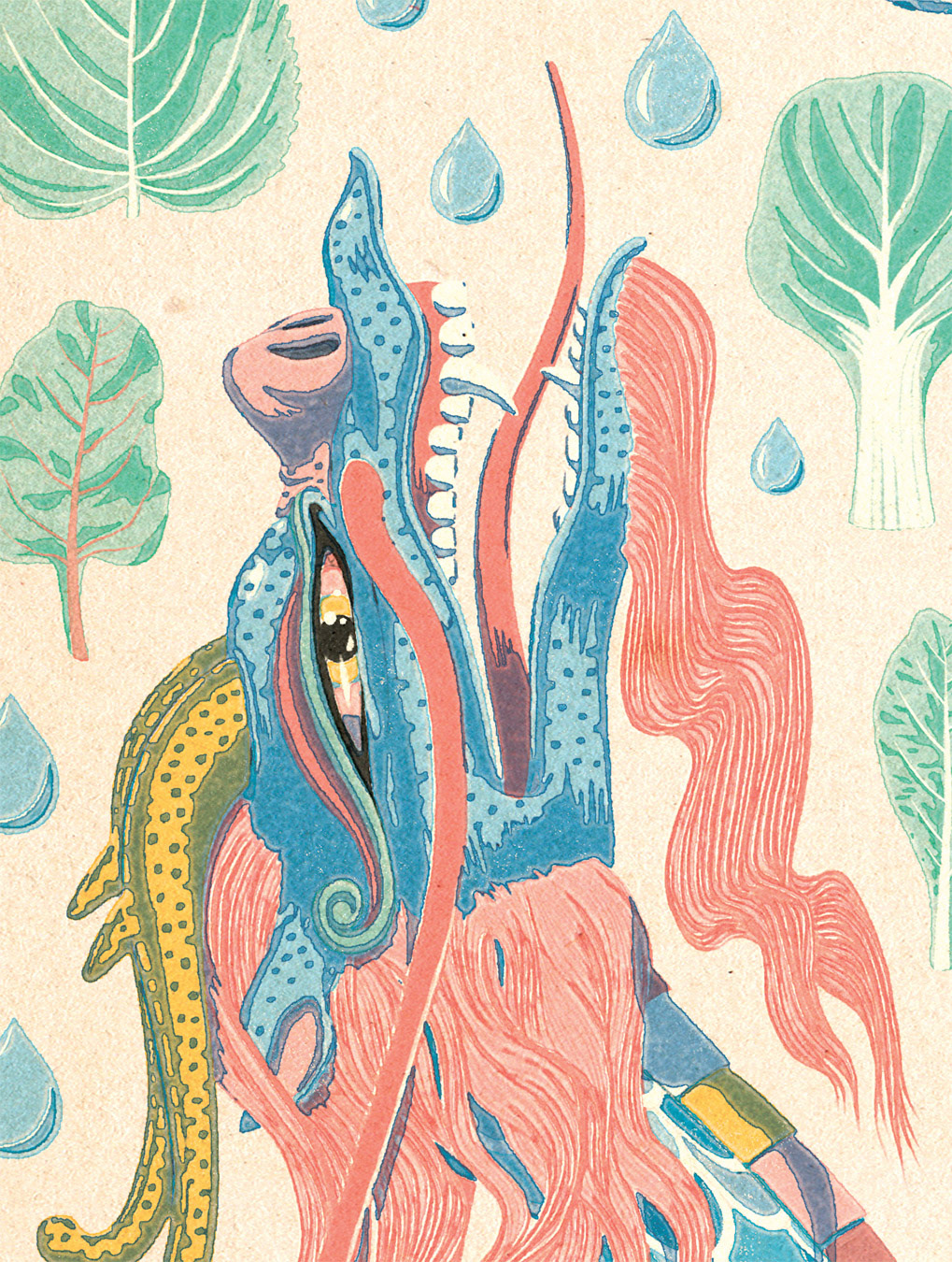 In Asia the dragon is viewed as a benevolent mythical creature. I don't see the aspect of agriculture used with the dragon that often so I wanted to use that as my inspiration since we have a rooftop vegetable garden that's connected me more with the food we eat. We eat a lot of Korean ssam bap, stuff wrapped in various lettuce leaves so I've populated the art with stuff like red leaf lettuce, chicory, ggaennip, etc. Korean dragons generally have 4 claws, Japanese 3 and Chinese 5. horns of a deer and scales like a fish. Dragons are made up of many kinds of animals, many of which are other zodiac animals, but it varies depending on who you talk to and here are some examples: the head of camel, eyes of a rabbit, claws of a hawk, nose of a pig, ears of a bull, horns of a stag, feet of a tiger, and the body of a snake. I imagined the dragon bringing the rain that nourishes our greens, and watches over them. I used True Grit Texture and Supply Co's Atomic action scripts to achieve this mid century print effect. I wanted to challenge myself and do something other than my overly rendered thing.